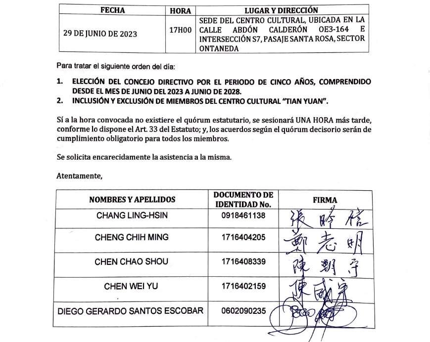 AUTOCONVOCATORIA A LA ASAMBLEA GENERAL EXTRAORDINARIA DEL CENTRO CULTURAL “TIAN YUAN”