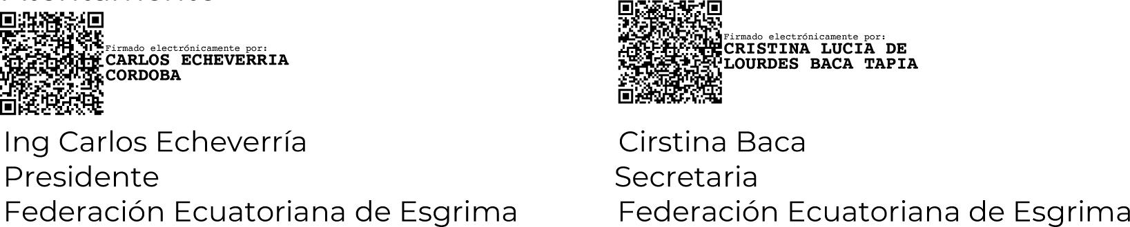 De conformidad con el Articulo 31, del Estatuto reformado y codificado por Federación Ecuatoriano de Esgrima se convoca a Asamblea General ordinaria de la Federación Ecuatoriana de Esgrima que se llevará a cabo en las en la Av. Seis de Diciembre y Av Naciones Unidas , Estadio Olímpico Atahualpa Accseo 3 Sala de Esgrima de Pichincha , para el día lunes 23 de Octubre del 2023, a las 18:00 donde se tratará el siguiente orden del día: