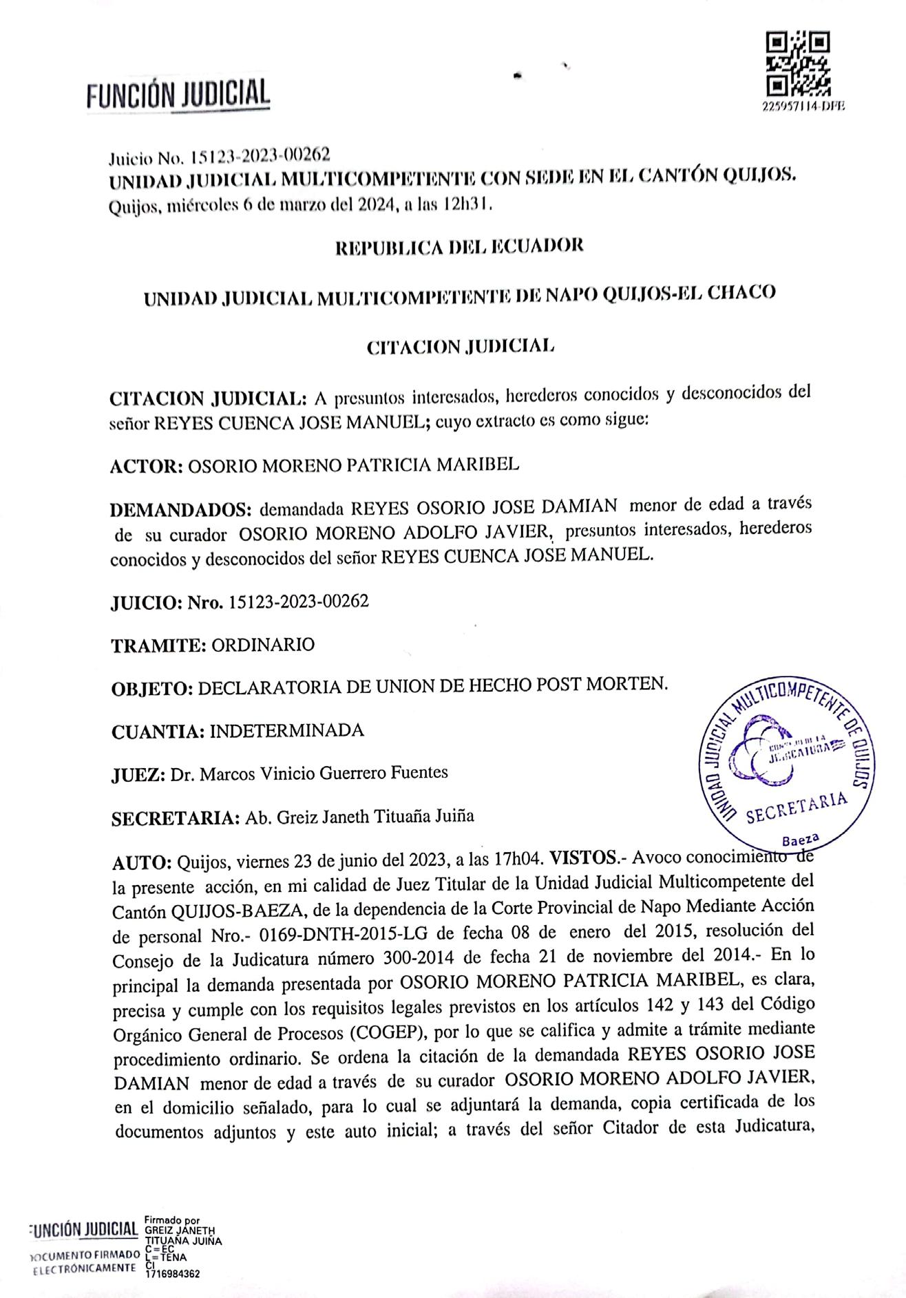 trámite mediante procedimiento ordinario. Se ordena la citación de la demandada REYES OSORIO JOSE DAMIAN menor de edad a través de su curador OSORIO MORENO ADOLFO JAVIER, en el domicilio señalado, para lo cual se adjuntará la demanda, copia certificada de los documentos adjuntos y este auto inicial; a través del señor Citador de esta Judicatura, debiendo advertirle de la obligación que tiene de señalar casillero judicial en esta judicatura