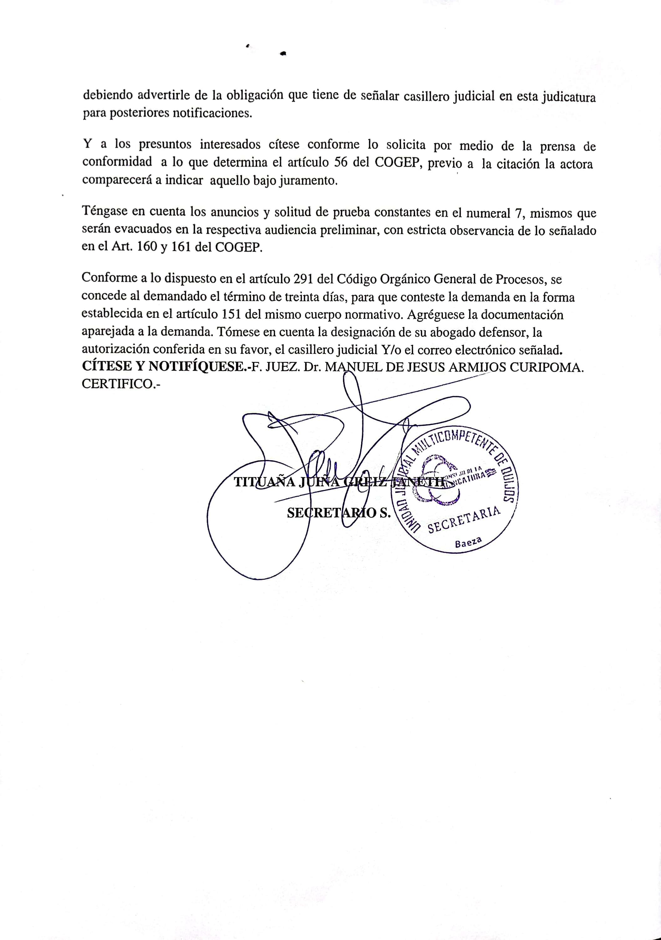 Se le previene al demandado de la obligación que tiene de comparecer a juicio, señalar casillero judicial y correo electrónico para recibir notificaciones, de contestar la demanda planteada en su contra en el término de DIEZ DIAS contados a partir de la citación, así como de anunciar los medios probatorios destinados a sustentar su contradicción observando lo dispuesto en los Arts. 151, 152, 153, 157 del Código Orgánico General de Procesos.- [3] ANUNCIO DE PRUEBAS: [3.1]