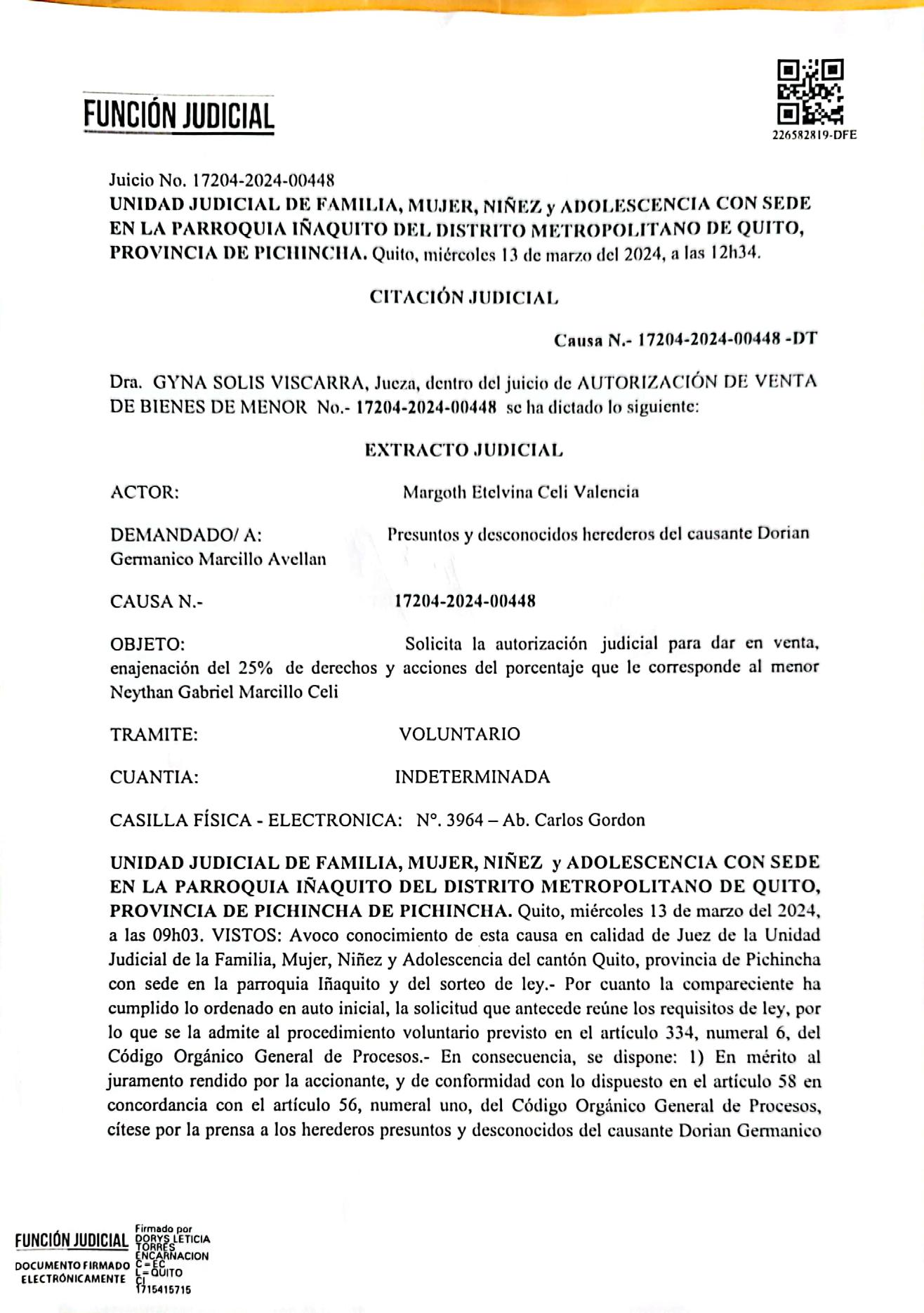 UNIDAD JUDICIAL DE FAMILIA, MUJER, NIÑEZ y ADOLESCENCIA CON SEDE EN LA PARROQUIA MARISCAL SUCRE DEL DISTRITO METROPOLITANO DE QUITO, PROVINCIA DE PICHINCHA. Quito, martes 2 de abril del 2024, a las 14h44. VISTOS: Agréguese a los autos el escrito que antecede, el mismo que en esta fecha se pone al despacho de la suscrita jueza para los fines consiguientes. Ab. Ana Alexandra Apolo Almeida, avoco conocimiento de la presente causa, en virtud del sorteo correspondiente, en mi calidad de Jueza Titular de la Unidad Judicial de la Familia, Mujer, Niñez y Adolescencia con sede en la Parroquia Mariscal Sucre del Distrito Metropolitano de Quito, provincia de Pichincha; y, asegurando competencia de conformidad con lo establecido en el Art. 175 de la Constitución de la República del Ecuador y artículos 233 y 234 del Código Orgánico de la Función Judicial.- En lo principal: [1] CALIFICACIÓN: Garantizando la tutela judicial efectiva, así como el interés superior de los niños, niñas y adolescentes, esta autoridad dispone: La demanda de PRIVACION DE PATRIA POTESTAD que antecede es clara, precisa y reúne los demás requisitos de ley previstos en el Arts. 142 del Código Orgánico General de Procesos, en tal virtud se la acepta al PROCEDIMIENTO SUMARIO previsto en los Art. 332 numeral 3 y Art. 333 del Código Orgánico General de Procesos.- [2] CITACIÓN: [2.1]