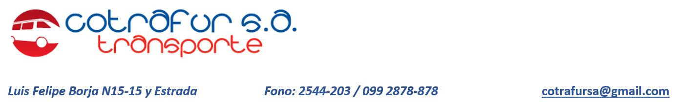 De conformidad con las disposiciones de la Ley de Compañías y el Art. Décimo Novenos de los Estatutos de la empresa se convoca a los señores accionistas de la Compañía de Transporte en Furgonetas COTRAFUR S.A. a la Junta General Extraordinaria, la misma que tendrá lugar el día viernes 23 de junio del 2023 a las 9H00 en la oficina de la compañía ubicada en la calle Av. 10 de Agosto N14-107 y Riofrio (Edifico Benalcazar Mil) del Distrito Metropolitano de Quito, para tratar el siguiente orden del día:
