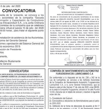 Conforme a lo dispuesto por la Ley de Compañías Codificada y a los Estatutos Sociales, se convoca a los señores accionistas de la Compañía COTRALICOTOGCHOA TRASNPORTE EN CAMIONETAS DOBLE CABINA S.A., a la Junta General Ordinaria de Accionistas que tendrá lugar en la Calle Bolívar N°. 610, entre las calles Montufar y García Moreno de la cuidad de Sangolquí, el día sábado 23 de marzo de 2024 a las 15h00 pm, con el siguiente orden del día.