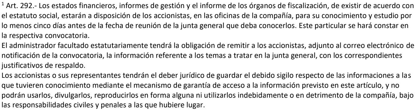 Se reitera que considerando el Artículo 292 de la Ley de Compañías1 que los balances, estados financieros, informes de comisario y de gerente general del año 2023, se encuentran a disposición de los señores accionistas para su revisión en la oficina de la compañía ubicada en (el Pasaje S26A Oe3 290 y Avenida Rumichaca) Parroquia de Turubamba, Provincia de Pichincha. Se deja expresa constancia que los documentos señalados, se exhiben en la dirección antes indicada con cinco (5) días de anticipación a la celebración de la junta general convocada. No obstante de aquello, en aplicación del inciso segundo y tercero del Art. 292 de la Ley de Compañías, se procede a notificar con esta convocaria con la información antes mencionada, pudiendo además revisarla de manera directa en las oficinas de la compañía. Siendo obligación de los accionistas el guardar el sigilio respectivo.