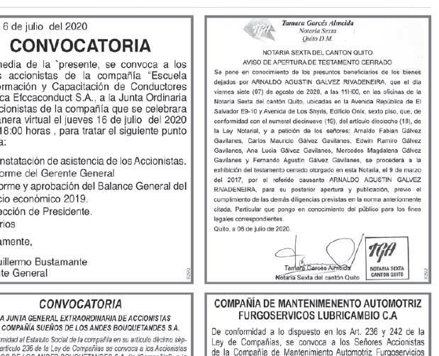 Se convoca de manera especial e individual al señor Fabián Arequipa, Comisario Principal de la compañía, domiciliado en la Calle Oe17a N5856 y Julio Jaramillo/ El Cisne – Barrio Atucucho del Distrito Metropolitano de Quito.