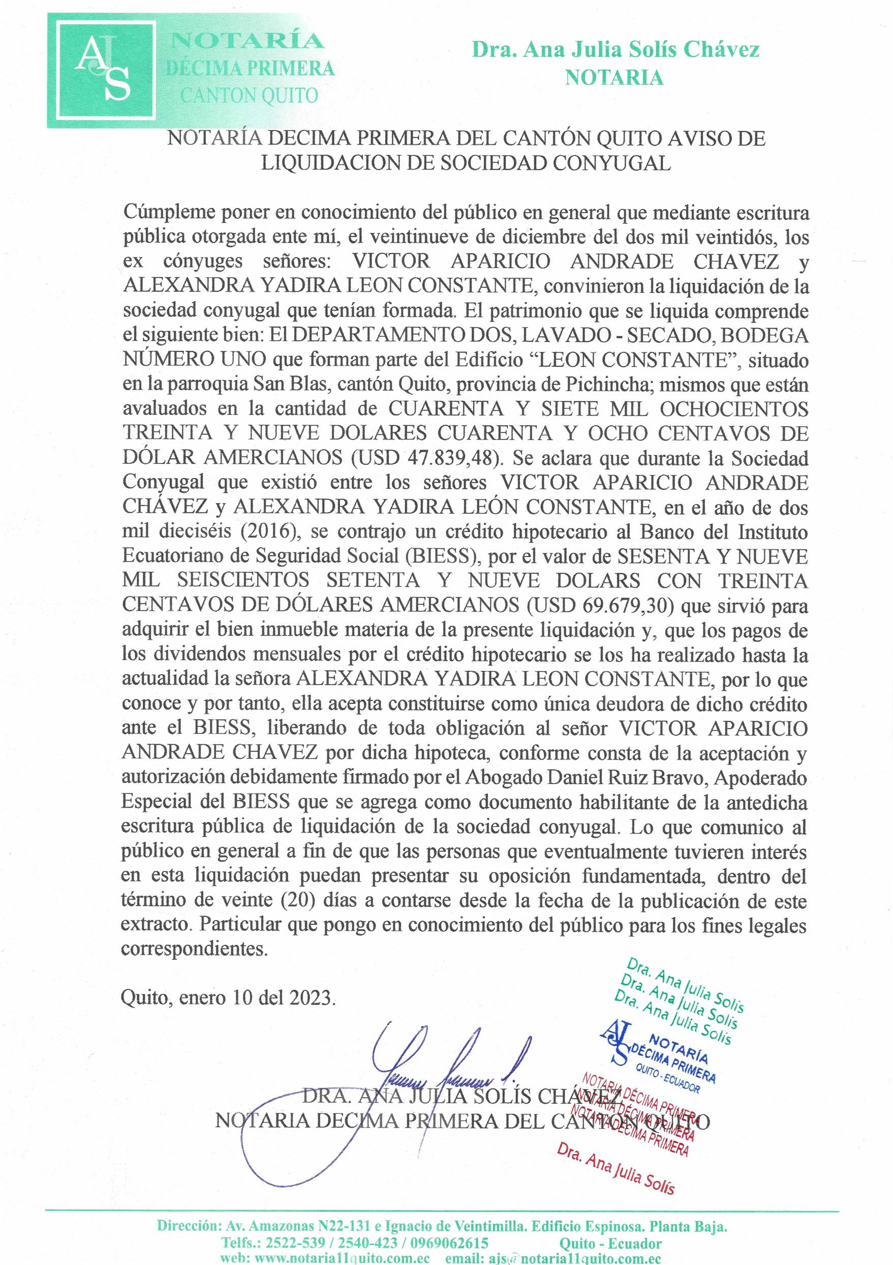 Cúmpleme poner en conocimiento del público en general que mediante escritura pública otorgada ente mí, el veintinueve de diciembre del dos mil veintidós, los ex cónyuges señores: VICTOR APARICIO ANDRADE CHAVEZ y ALEXANDRA YADIRA LEON CONSTANTE, convinieron la liquidación de la sociedad conyugal que tenían formada. El patrimonio que se liquida comprende el siguiente bien: El DEPARTAMENTO DOS, LAVADO - SECADO, BODEGA NUMERO UNO que forman parte del Edifcio “LEON CONSTANTE”, situado en la parroquia San Blas, cantón Quito, provincia de Pichincha; mismos que están avaluados en la cantidad de CUARENTA Y SIETE MIL OCHO-