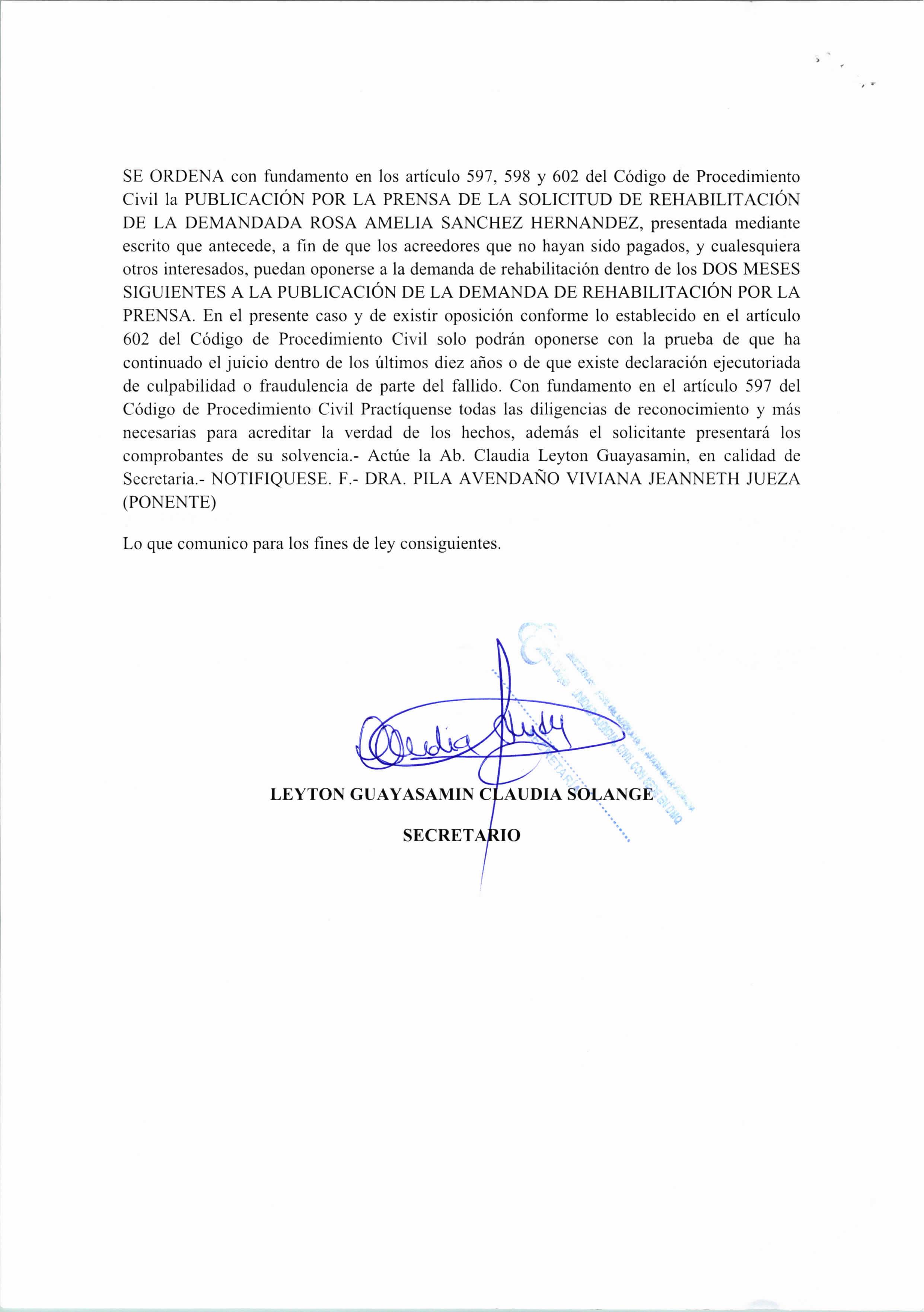 CUANTÍA: INDETERMINADA UNIDAD JUDICIAL CIVIL CON SEDE EN LA PARROQUIA IÑAQUITO DEL DISTRITO METROPOLITANO DE QUITO, PROVINCIA DE PICHINCHA. Quito, viernes 9 de septiembre del 2022, a las 15h29. Avoco conocimiento de la presente causa en calidad de Jueza Titular de esta Unidad Judicial Civil con sede en el D.M. de Quito y en virtud del sorteo realizado. Agréguese al proceso los escritos y documentos adjuntos presentados. En atención a lo solicitado se dispone: 1.- Previo a proveer lo que en derecho corresponde, la señora Secretaria de ésta Judicatura, siente la respectiva razón del tiempo transcurrido desde la última providencia útil hasta la presentación de escritos que anteceden, tómese en cuenta la aprte demandada a sus abogados en la defensa de la presente causa, como el casillero electrónico y correos electrónicos designados para recibir futuras notificaciones. 2.- De conformidad con lo establecido en el inciso cuarto del artículo 597 del Código de Procedimiento Civil y previo a EMITIR LA RESOLUCIÓN QUE CONCEDE LA REHABILITACIÓN DE LA DEMANDADA ROSA AMELIA SANCHEZ HERNANDEZ, SE ORDENA con fundamento en los artículo 597, 598 y 602 del Código de Procedimiento Civil la PUBLICACIÓN POR LA PRENSA DE LA SOLICITUD DE REHABILITACIÓN DE LA DEMANDADA ROSA AMELIA SANCHEZ HERNANDEZ, presentada mediante escrito que antecede, a fin de que los acreedores que no hayan sido pagados, y cualesquiera otros interesados, puedan oponerse a la demanda de rehabilitación dentro de los DOS MESES SIGUIENTES A LA PUBLICACIÓN DE LA DEMANDA DE REHABILITACIÓN POR LA PRENSA. En el presente caso y de existir oposición conforme lo establecido en el artículo 602 del Código de Procedimiento Civil solo podrán oponerse con la prueba de que ha continuado el juicio dentro de los últimos diez años o de que existe declaración ejecutoriada de culpabilidad o fraudulencia de parte del fallido. Con fundamento en el artículo 597 del Código de Procedimiento Civil Practíquense todas las diligencias de reconocimiento y más necesarias para acreditar la verdad de los hechos, además el solicitante presentará los comprobantes de su solvencia.Actúe la Ab. Claudia Leyton Guayasamin, en calidad de Secretaria.- NOTIFIQUESE. F.- DRA.