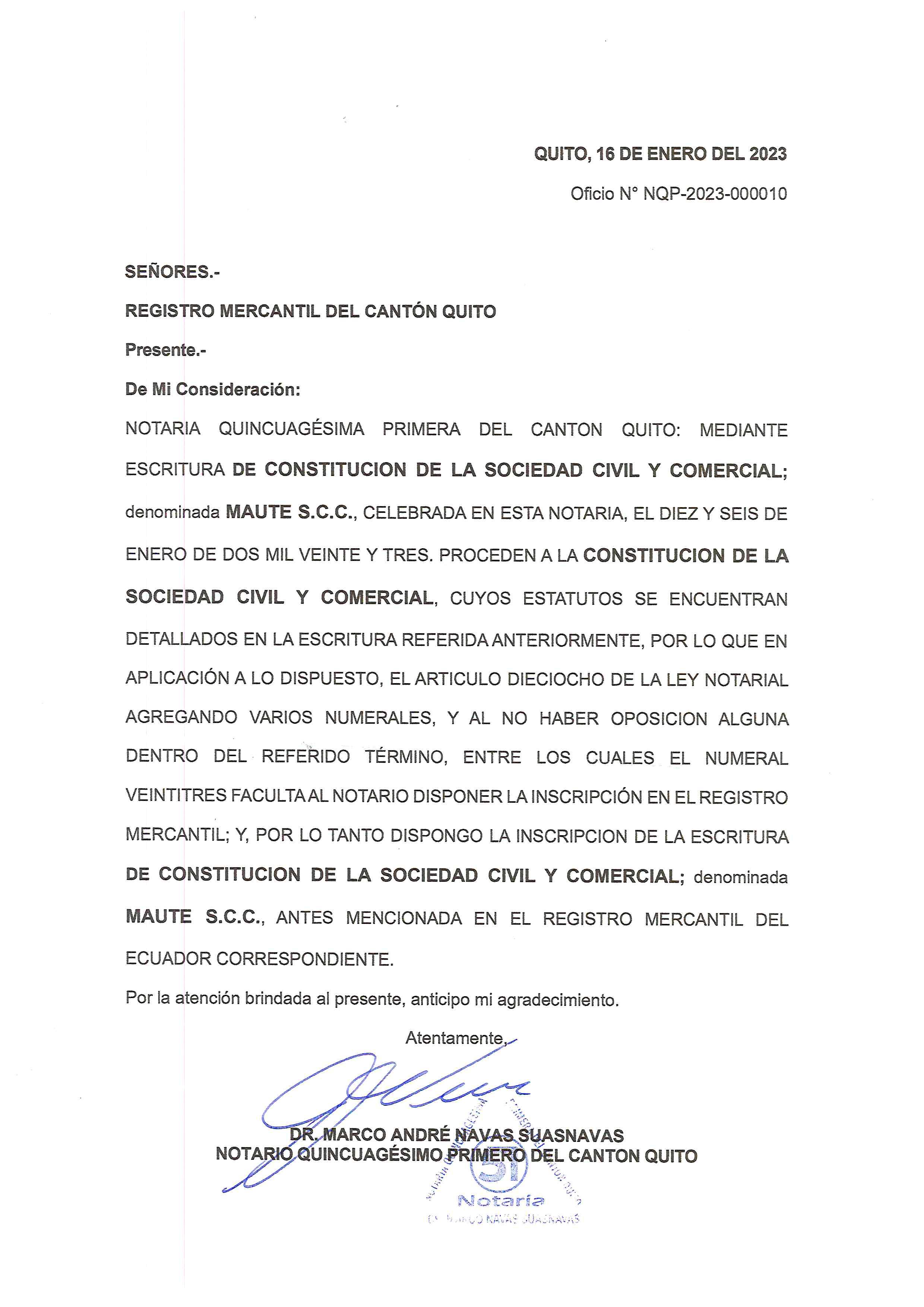 Lo que comunico a usted para los fines de ley, previniéndole de la obligación de señalar casilla judicial, en la ciudad de Quito, Provincia de Pichincha, para posteriores notificaciones.