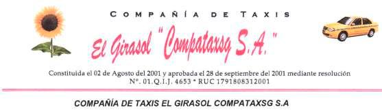 A La Ley De Compañías, se convoca a los Sres. Accionistas de la Compañía de transporte en taxis el Girasol COMPATAXSG S.A, a la Junta General Ordinaria Presencial, que se llevará a cabo el día martes 14 de febrero del 2023, a las 8:00 horas, en la sede de la compañía, ubicada en la ciudad de Quito, Sector San Blas, Calle Santa Prisca 257 y Pasaje Farget, piso 3, oficina 303-304, edificio Valladares Mayorga para tratar el siguiente orden del día: