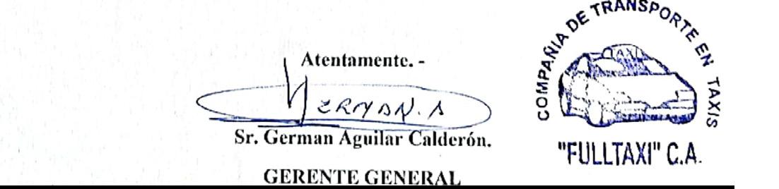 Sangolquí, 02 de marzo del 2023. Se convoca a los accionistas de la Compañía FULLTAXI C.A. a la junta general ordinaria que tendrá lugar el día miércoles 15 de marzo del presente año, a las 10: 00 am, en la casa Barrial Terán Barea ubicada en la calle 10 de diciembre Catacocha y Guamote, para tratar el siguiente orden del día: