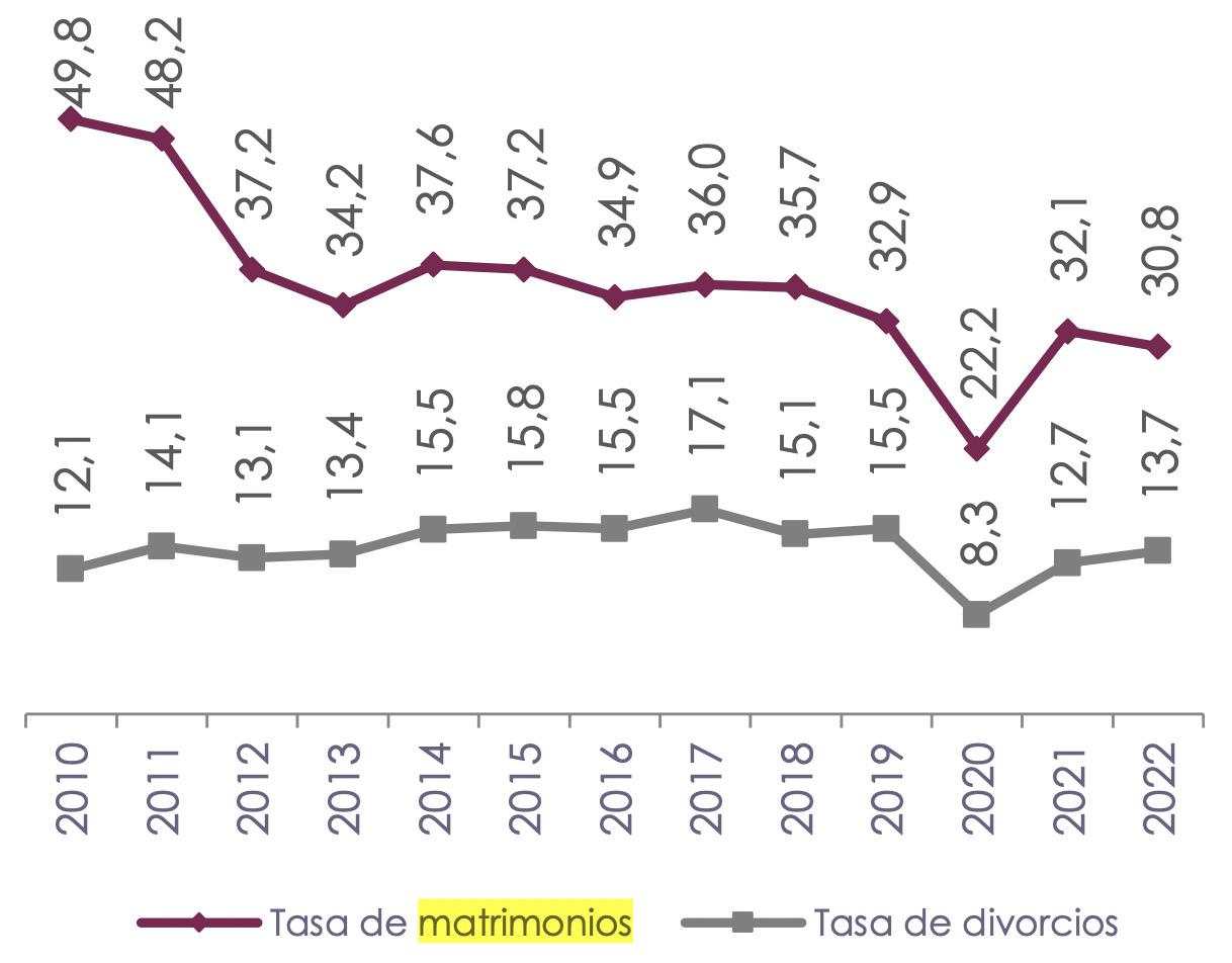 En los mismos periodos los divorcios aumentaron de 22.488 a 24.595, respectivamente.