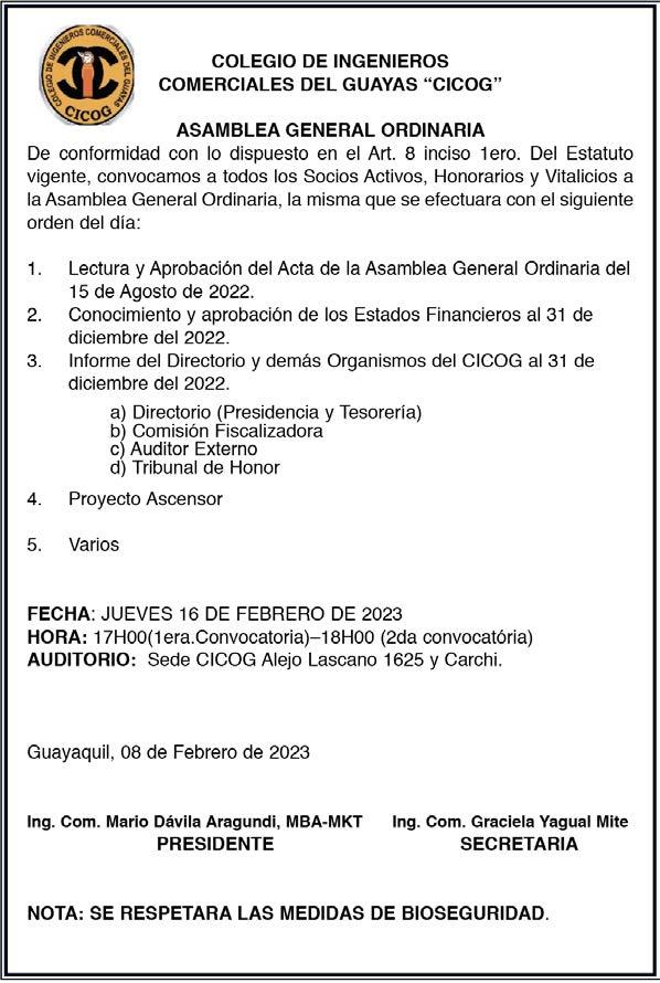 NOTA: de manera especial y presencial se convoca al Comisario de la compañía, Sr. Luis Quinsasamin.