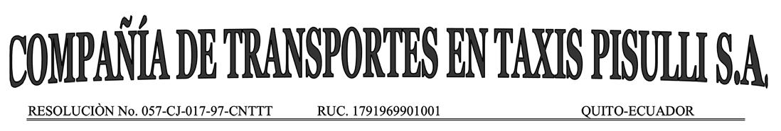 De acuerdo con la Ley de Compañías y el Estatuto Social, se convoca a Junta General Ordinaria de Accionistas de la COMPAÑÍA DE TRANSPORTE EN TAXIS PISULLI S.A., a celebrarse el día miércoles 22 de marzo del 2023, en la Francisco Daquilema N71-256 N71 F Y Mariscal Sucre sede de la Liga el Condado junto al UPC, a las 11 y 30 am para tratar el siguiente Orden del Día: