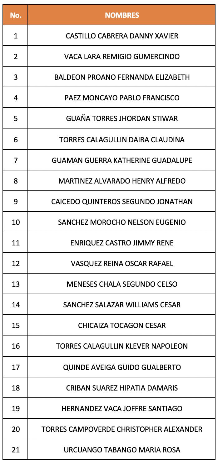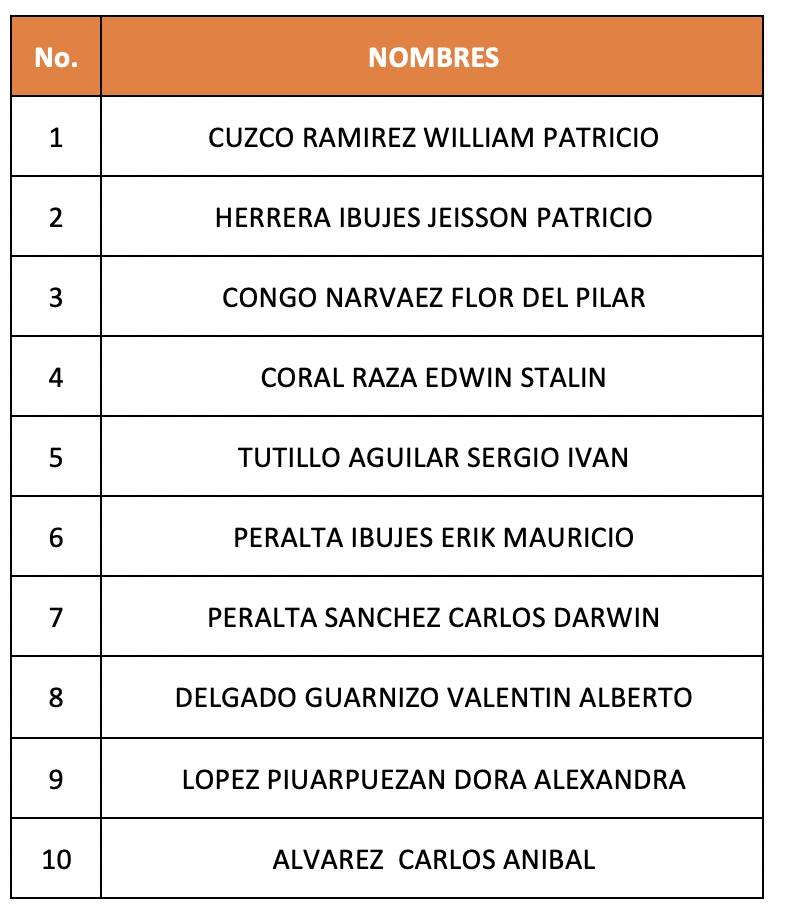 En cumplimiento de lo establecido en el artículo 32, numeral 4 del Reglamento Interno de la Cooperativa de Ahorro y Crédito “Policía Nacional Ltda”, CITO a los socios que se detallan a continuación, comunicándoles que se ha iniciado un Procedimiento Sancionador en su contra, por haber incurrido en la causal establecida en el numeral 2 del artículo 10 del Estatuto Social Por lo que se les otorga el término de 10 días laborables, para que presenten su contestación con los descargos, anuncio de pruebas y correo electrónico para notificaciones, esta deberá ser entregada en la sec retaria del Consejo de Vigilancia ubicada en Edificio Matriz de la Cooperativa en la Avenida 10 de Agosto y Mariana de Jesús de la ciudad de Quito, Provincia de Pichincha, onceavo piso.