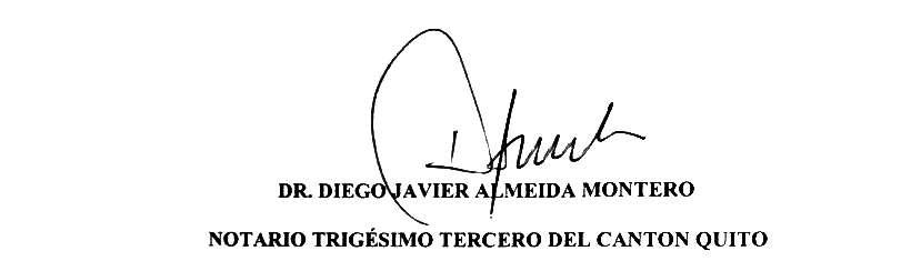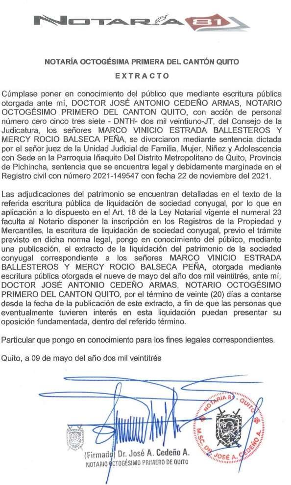 En Quito a los ocho días de mayo de dos 2023.- Atendiendo la petición, de conformidad con lo establecido en el artículo dieciocho números veintinueve de la Ley Notarial y las atribuciones a mí conferida, publíquese por una sola vez el presente extracto, en uno de los diarios de mayor circulación de esta ciudad. Lo que pongo en conocimiento del público para los fines consiguientes