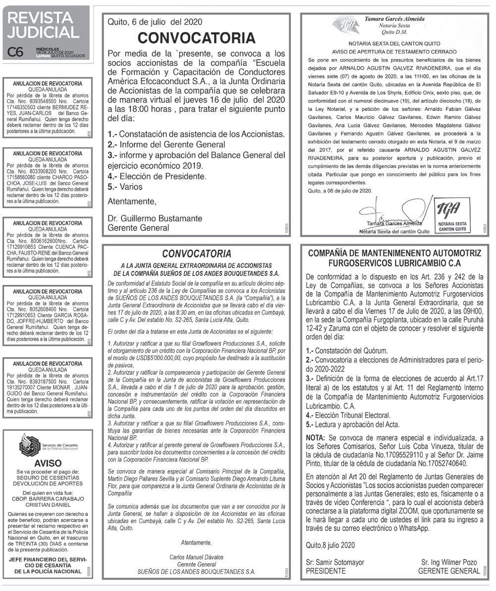 A JUNTA GENERAL EXTRAORDINARIA DE ACCIONISTAS DE COMPAÑIA DE TRANSPORTE PESADO FICUSEXPRESS S.A. De conformidad con lo establecido en el Art. 236 de la Ley de Compañías y en los Estatutos de la COMPAÑIA DE TRANSPORTE PESADO FICUSEXPRESS S.A, convoca a los señores accionistas; a la junta General Extraordinaria a realizarse el día Viernes 04 de agosto del 2023, a partir de las 13H00 que se realizara en el domicilio principal de la compañía, ubicado en la Calle QUILLA ÑAN S47D y OE2F, Parroquia Guamaní, Ciudad Quito y Cantón Quito para conocer y resolver el siguiente orden del día: