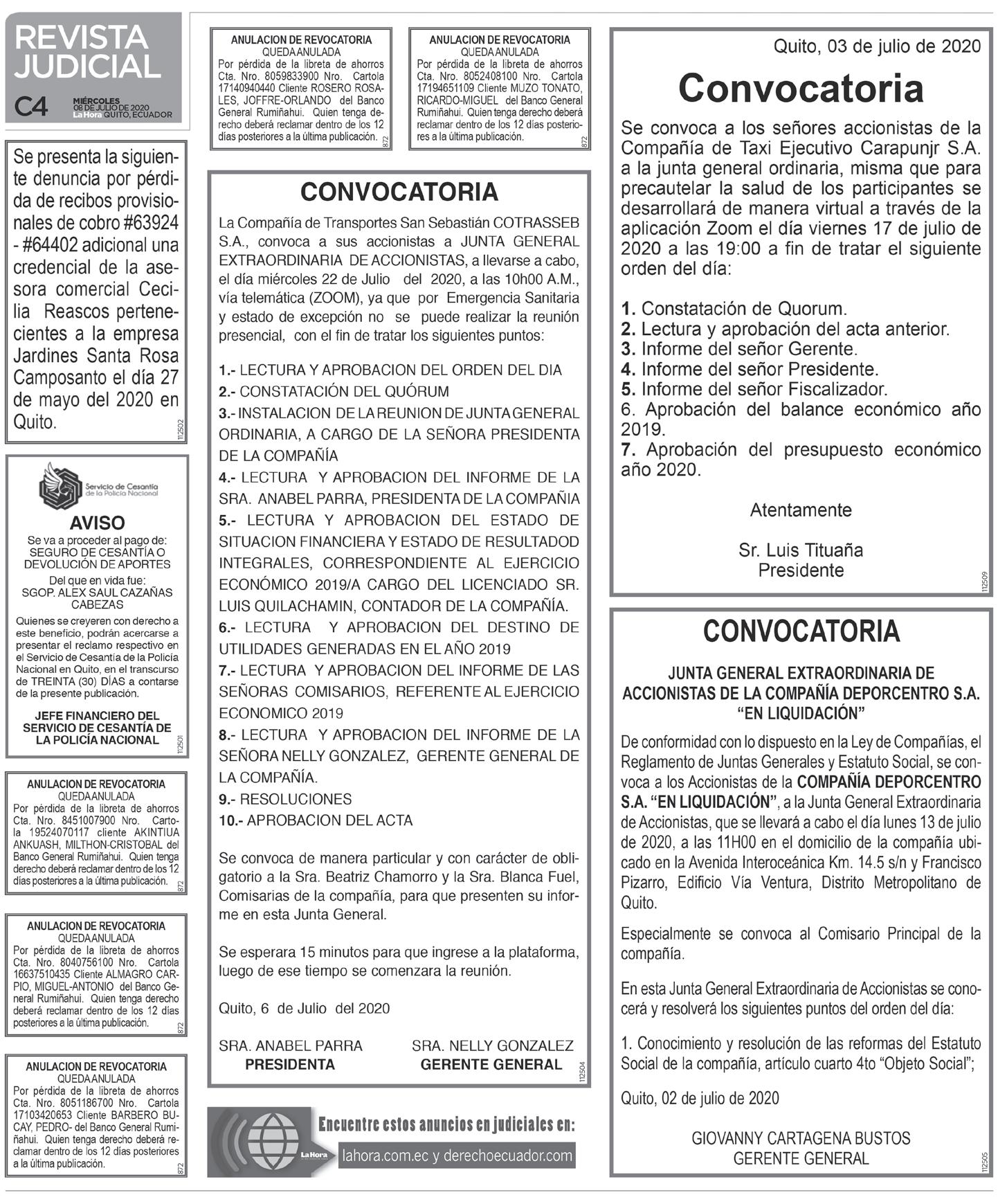 En caso de no existir quorum legal en la primera convoca toria, oportunamente se convocará por segunda vez con forme determina la Ley de Compañías.