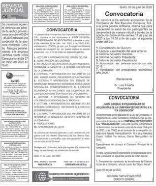 Se convoca de manera especial e individual al Sr Franklin Pérez Rivera, Comisario Principal de la Compañía con domicilio ubicado en el sector de Capelo las Acacias N98 y Arupos del Cantón Rumiñahui.
