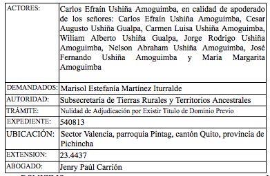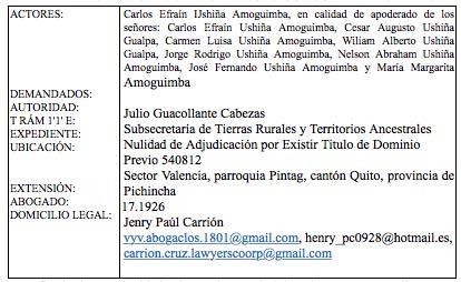 A fin de dar continuidad a las acciones administrativas que se ventilan en esta dependencia, de conformidad a la legislación aplicable en materia de tierras me permito poner en su conocimiento que, dentro de la acción administrativa de NULIDAD DE ADJUDICACION POR EXISTIR UN LEGÍTlMO TÍTULO DE DOMINIO PREVIO SOBRE EL PREDIO ADJUDICADO, signado con el Nro. 540811, presentada por el señor Carlos Efraín Ushiña Amoguimba, en calidad de apoderado de los señores: Carlos Efraín Ushiña Amoguimba, Cesar Augusto Ushiña Gualpa, Carmen Luisa Ushiña Amoguimba, Wiliam Alberto Ushiña Gualpa, Jorge Rodrigo Ushiña Amoguimba, Nelson Abraham Ushiña Amoguimba, José Fernando Ushiña Amoguimba y María Margarita Amoguimba; en contra de la señora Sonia Azucena Villamarin Mena; sobre un predio con una superficie de 34. ubicado en el sector Valencia, parroquia Pintag, cantón Quito, provincia de Pichincha, se ha dictado el siguiente acto administrativo: