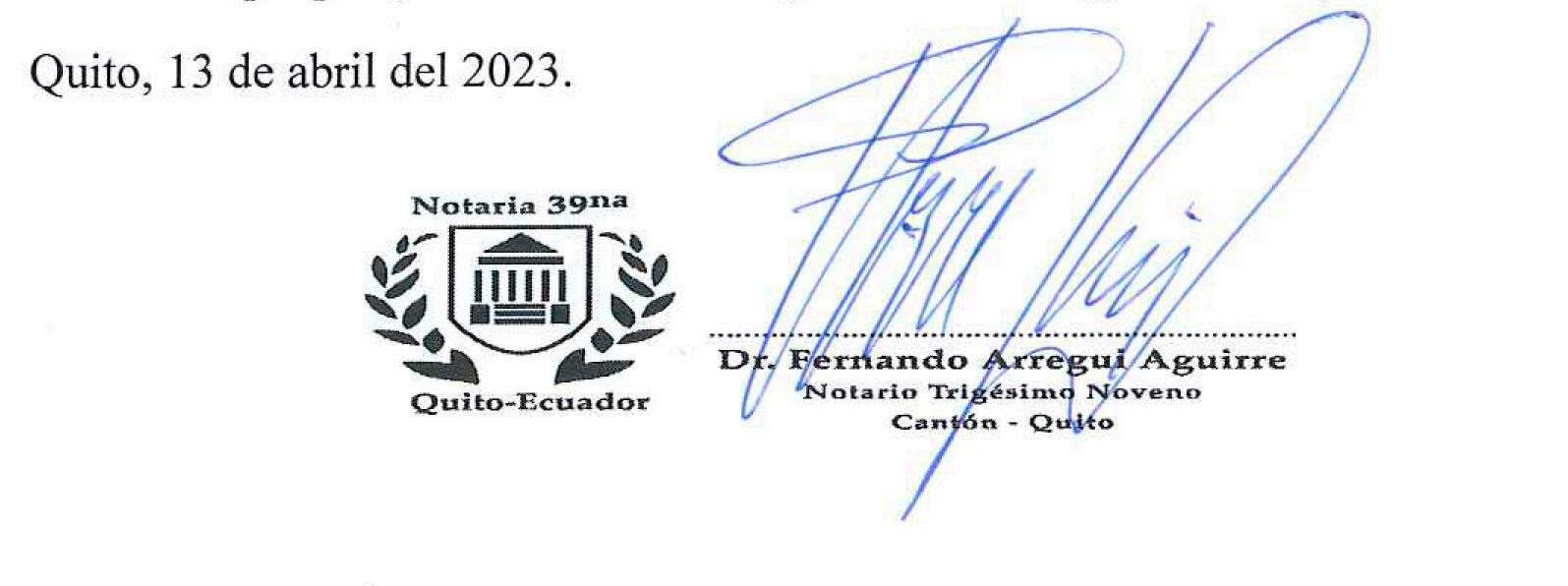 En cumplimiento de lo dispuesto en el artículo 292 de la Ley de Compañías, se informa a los accionistas que el balance general y estado de la cuenta de pérdidas y ganancias y sus anexos, el informe del señor Gerente General, el informe de la señora Comisaria, del ejercicio económico del año 2022, se encuentran para su conocimiento y estudio, en la oficina de la compañía ubicada en el Barrio Caupicho calle S51E lote Nro. 710 y calle E4J del Distrito Metropolitano de Quito.