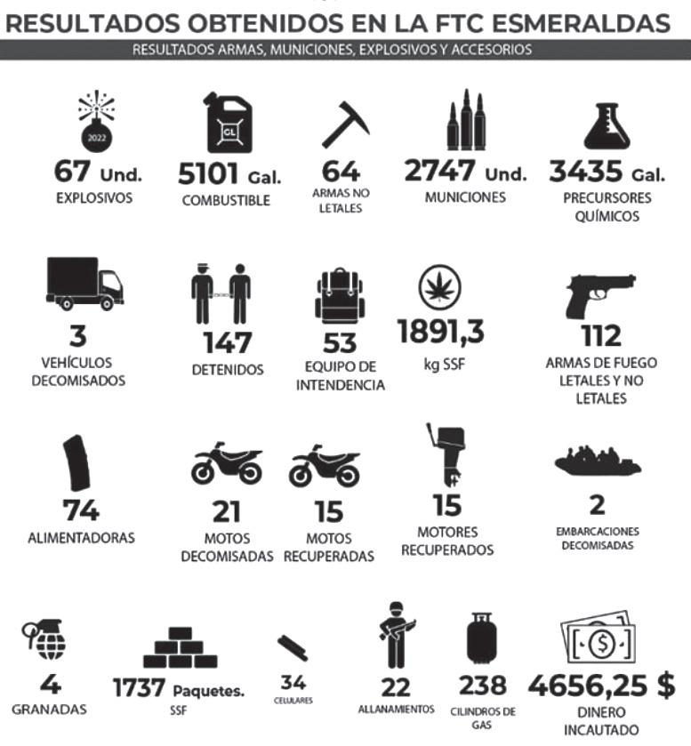 pública el informe de re sultados de lo operativos realizados en la provincia de Esmeraldas desde junio a noviembre del presente año, en el cual se informa que se movilizaron 1613 efectivos y se ejecutaron 8893 operaciones milita res, el resultado de armas, municiones explosivos y accesorios en este rango de tiempo fue: 67 unidades de explosi vos, 5101 galones de com bustible, 64 armas no leta les, 2747 municiones, 3435 galones de precursores químicos, 3 vehículos de comisados, 147 personas detenidas, 53 equipos de intendencia, 1891,3 kg de Sustancias sujetas a fisca lización, 112 armas de fue go letales y no letales, 74 alimentadoras, 21 motos decomisadas , 15 motos re cuperadas, 15 motores de embarcaciones recupera dos, 2 embarcaciones deco misadas, 4 granadas, 1737 paquetes de sustancias su jetas a fiscalización, 22 alla namientos, 238 cilindro de gas y una suma de 4656,25 dólares incautados.