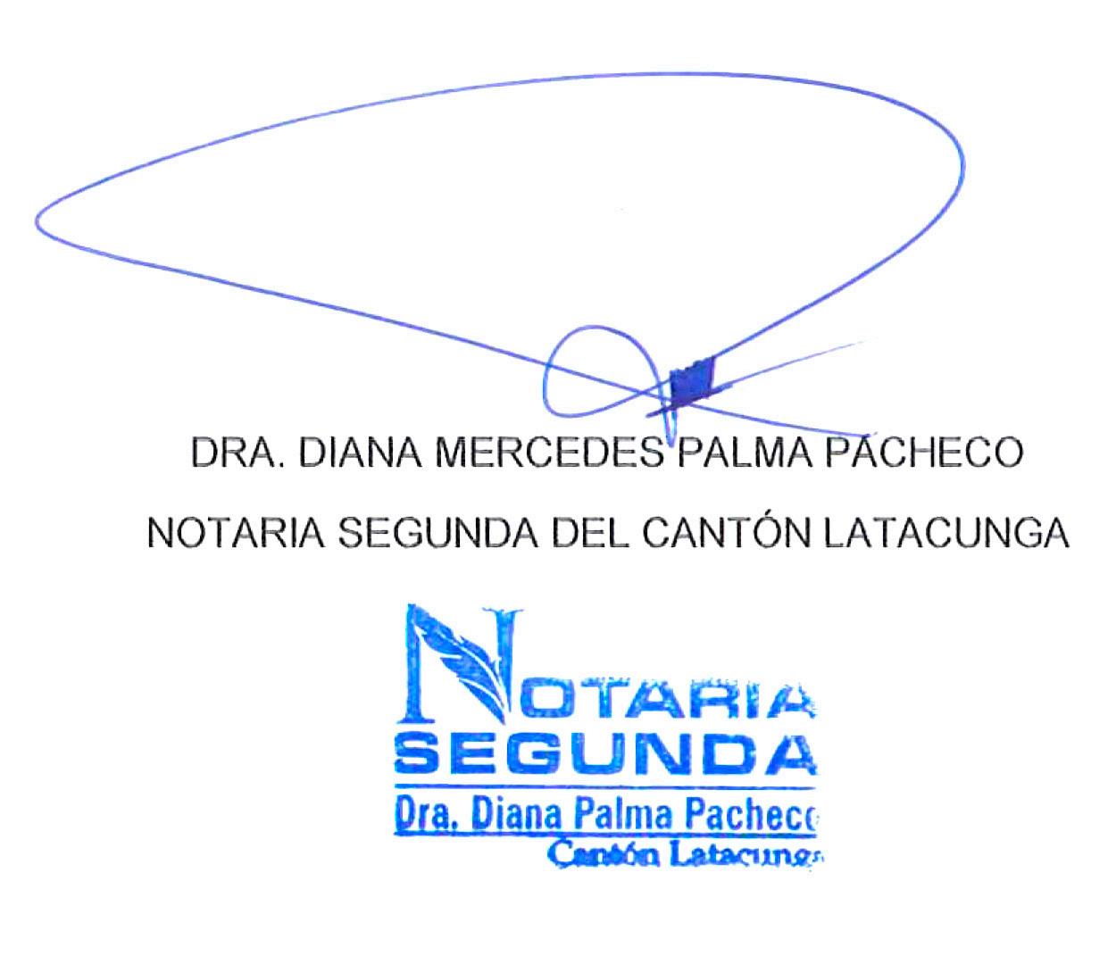 Se pone en conocimiento del público en general, que ante mi DOCTORA DIANA MERCEDES PALMA PACHECO, NOTARIA SEGUNDA DEL CANTÓN LATACUNGA, se ha procedido a suscribir con fecha 28 de noviembre del año 2022, la escritura pública de Liquidación Voluntaria de la Sociedad Conyugal de bienes sociales habida entre los señores HERNÁN ALEJANDRO SOLÍS BARTELOTTI y MARÍA JOSÉ NAVARRETE TERÁN, misma que fuera disuelta mediante Disolución de la Sociedad conyugal. Las adjudicaciones del patrimonio se encuentra detalladas en el texto de la referida escritura pública de liquidación de la sociedad conyugal cuya copia certificada se agrega de la cual se extracta lo siguiente. TERCERA.- DE LA LIQUIDACIÓN VOLUNTARIA DE LA SOCIEDAD CONYUGAL: con los antecedentes expuestos que son parte esencial e integrante del presente instrumento, los comparecientes en forma libre y voluntaria liquidan los activos y pasivos adquiridos durante la vigencia de la sociedad conyugal, en la siguiente forma: Al señor HERNÁN ALEJANDRO SOLÍS BARTELOTTI, se le asigna el inmueble DEPARTAMENTO número BD dos, incluido cuarto de máquinas, alícuota CUATRO PUNTO OCHO UNO CERO NUEVE POR CIENTO (4.8109%); PARQUEADERO BD dos P dos, alícuota parcial CERO PUNTO SEIS CINCO SIETE SIETE POR CIENTO (0 6577%); PARQUEADERO BD dos P dos guion dos, alícuota parcial CERO PUNTO SEIS CINCO SIETE SIETE POR CIENTO (0.6577%); BODEGA BD dos B dos, alícuota parcial CERO PUNTO UNO UNO TRES SIETE POR CIENTO (0.1137%); ÁREA DE LAVANDERÍA BE) uno dos S dos, alícuota parcial CERO PUNTO TRES CINCO SEIS OCHO POR CIENTO (0.3568%). ALÍCUOTA TOTAL SEIS PUNTO CINCO NUEVE SEIS OCHO POR CIENTO bloque B, que forman parte del Conjunto Habitacional NATANAEL, construido sobre el inmueble número OCHENTA Y SIETE de la Manzana E, ubicado en la parcelación Carcelén, (Sección Tres Alta), de la parroquia Cotocollao, cantón Quito, provincia de Pichincha, circunscritos dentro de los “ siguientes linderos, alícuotas y dimensiones: LINDEROS SINGULARES DEL DEPARTAMENTO BD DOS, INCLUIDO CUARTO DE MAQUINAS: Nivel: Más cinco coma setenta y ocho, más seis coma treinta y dos. Alícuota Parcial: Cuatro punto ocho uno cero nueve por ciento. Linderos: Norte: trece metros veinte y un centímetros con proyección circulación vehicular comunal; Sur: Once metros setenta y dos centímetros, con departamento AD dos y un metro cuarenta y nueve centímetros con caja de gradas comunal; Este: cinco metros ochenta y seis centímetros con proyección circulación peatonal comunal y un metro veinte centímetros con caja de gradas comunal; Oeste: siete metros cero seis centímetros con proyección área recreativa comunal abierta superior noventa y un metros cuadrados cuarenta y tres decímetros cuadrados con departamento BD tres; e, INFERIOR: noventa y un metros cuadrados cuarenta y tres decímetros cuadrados con departamento BD LINDEROS SINGULARES DE PARQUEADERO BD dos P dos: Nivel: más cero punto setenta y cuatro. Alícuota Parcial: Cero punto seis cinco siete siete por ciento. Linderos: Norte: dos metros cincuenta centímetros con parqueadero BD dos P dos guion dos; Sur: dos metros cincuenta centímetros con área recreativa comunal abierta; Este: cinco metros con salón comunal; Oeste: cinco metros con propiedad particular; Superior: doce metros cuadrados cincuenta decímetros cuadrados con cielo; e, INFERIOR: doce metros cuadrados cincuenta decímetros cuadrados con suelo. LINDEROS SINGULARES DE PARQUEADERO BD dos P dos guion dos: Nivel: más cero punto setenta y cuatro. Alícuota Parcial: Cero punto seis cinco siete siete por ciento. Linderos: Norte: dos metros cincuenta centímetros con circulación vehicular comunal; Sur: dos metros cincuenta centímetros con parqueadero BD dos P dos; Este: cinco metros con parqueadero BD tres P tres; Oeste: cinco metros con propiedad particular; Superior: doce metros cuadrados cincuenta decímetros cuadrados con cielo; e, INFERIOR: doce metros cuadrados cincuenta decímetros cuadrados con suelo. LINDEROS SINGULARES DE BODEGA BD DOS B DOS: Nivel: más cero punto setenta y dos. Alícuota Parcial: Cero punto uno uno tres siete por ciento. Linderos: Norte: un metro cero nueve centímetros con parqueadero AD uno P uno; Sur: un metro cero nueve centímetros con circulación peatonal comunal; Este; un metro noventa y nueve centímetros con bodega BD uno B uno; Oeste: un metro noventa y nueve centímetros con bodega BD tres B tres; Superior: dos metros cuadrados dieciséis decímetros cuadrados con departamento BD uno; e, INFERIOR: dos metros cuadrados dieciséis decímetros cuadrados con suelo. LINDEROS SINGULARES DE ÁREA DE LAVANDERÍA BD UNO DOS S DOS: Nivel más diez punto ochenta y dos. Alícuota Parcial: Cero punto tres cinco seis ocho por ciento. Linderos: Norte: tres metros con área de lavandería BD tres S tres; Sur: tres metros con área de lavandería BD uno S uno; Este: dos metros veinte y seis centímetros con terraza accesible comunal; Oeste: dos metros veinte y seis centímetros con losa inaccesible; Superior: seis metros cuadrados setenta y ocho decímetros cuadrados con cielo; e, INFERIOR: seis metros cuadrados setenta y ocho decímetros cuadrados con departamento BD tres.- Con un avalúo municipal de SESENTA Y CUATRO MIL CUATROCIENTOS SESENTA DÓLARES CON NOVENTA Y OCHO CENTAVOS (usd. 64.460,98). A la señora MARÍA JOSÉ NAVARRETE TERÁN, se le asigna el vehículo de las siguientes características: Marca: CHEVROLET, Tipo: SEDAN; Clase: AUTOMOVIL, Modelo: SAIL TM 1.4 4P 4X2 AC Motor: (LCU 123173198); Chasis: (8LAUY5274D0200018); Color: BLANCO; Año de Fabricación: DOS MIL TRECE; Placas: X B B UNO SEIS OCHO DOS (XBB1682); avaluado comercialmente en DIEZ MIL DÓLARES (USD. 10.000,00) asi como también se le asigna el Menaje de casa conformado por un juego de sala y comedor, refrigeradora, lavadora de ropa, secadora de ropa, un televisor, dos juegos de dormitorio avaluado en DIEZ MIL DÓLARES (USD, 10.000,00), ademá