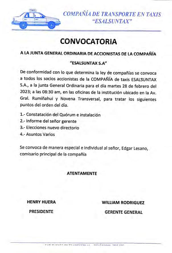 De conformidad con lo establecido en los Estatutos de la Compañía, la Ley de Compañías y en el Reglamento sobre Juntas Generales de Socios y Accionistas de compañías de Responsabilidad Limitada, Anónimas, en Comandita por Acciones y de Economía Mixta, según lo indica el artículo 119 y 237 de la Ley de Compañías de la República del Ecuador, el señor Presidente Juan Carlos Valencia Tanquina, convoca a los accionistas de la empresa sociedad anónima COMPAÑÍA DE TRANSPORTE DE CARGA PESADA YÁNEZ Y VALENCIA TRANSYANEZVALENCIA S.A a la Junta General Extraordinaria de Accionistas que se realizará el día 01 de Marzo del 2023, a las 14:00 pm la cual se realizará en las oficinas de la compañía, ubicadas en la ciudad de Quito, en las calles Tocachi E2-36 y Palenque oficina Planta baja de la ciudadela Monseñor Leónidas Proaño, barrio San Bartolo, parroquia La Magdalena, para tratar el siguiente orden del día:
