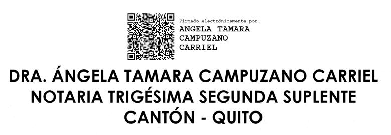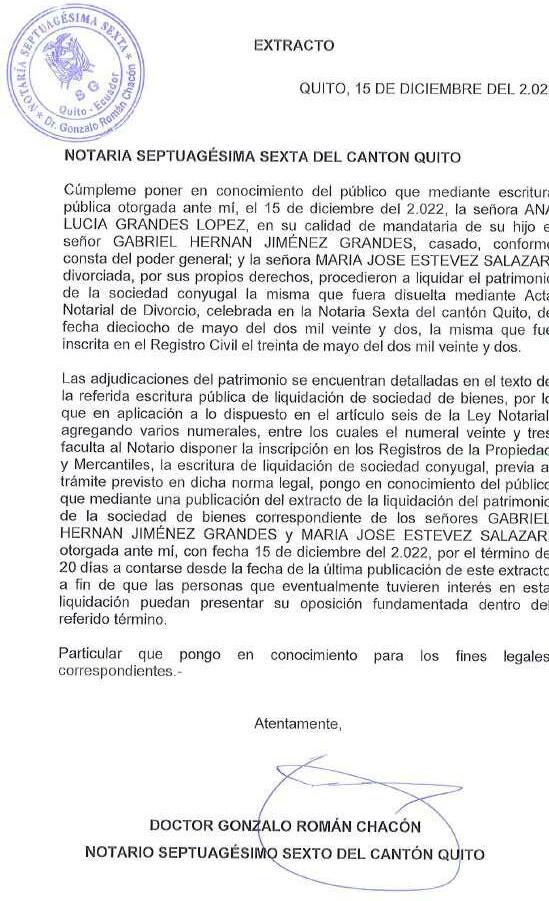 Pongo en conocimiento del público que mediante Escritura Pública, otorgada ante mí Doctora Ángela Tamara Campuzano Carriel, Notaria Trigésima Segunda Suplente del Cantón Quito, el 16 de diciembre del 2022, los señores Efraín Armando Campaña Vega; y, Mercedes Avila Lascano, procedieron a Liquidar la Sociedad conyugal, la cual fue disuelta, en virtud de la disolución del vínculo matrimonial que fue efectuado, mediante Acta Notarial de Divorcio de fecha 16 de noviembre del 2021, ante el Notario Tercero del Cantón Rumiñahui, y con fecha 19 de noviembre del mismo año se inscribió, tomando razón al margen del Acta de Matrimonio. Las adjudicaciones del patrimonio se encuentran detalladas en el texto de la referida escritura pública de liquidación de sociedad conyugal, por lo que en aplicación a lo dispuesto en el Art. 18 numeral 23, artículo reformado por Disposición Reformatoria Décimo Quinta de Ley No. 0, publicada en Registro Oficial Suplemento 506 de 22 de Mayo del 2015 , faculta al Notario disponer la inscripción en los Registros de la Propiedad y Mercantiles, la escritura de liquidación de sociedad conyugal, previo el trámite previsto en dicha norma legal, pongo en conocimiento del público, mediante una publicación, el extracto de la liquidación del patrimonio de la sociedad conyugal correspondiente a los señores Efraín Armando Campaña Vega; y, Mercedes Avila Lascano, otorgada mediante escritura pública de 16 de diciembre del 2022 ante esta notaría, por el término de veinte (20) días a contarse desde la fecha de la última publicación de este extracto, a fin de que las personas que eventualmente tuvieren interés en esta liquidación puedan presentar su oposición fundamentada, dentro del referido término.