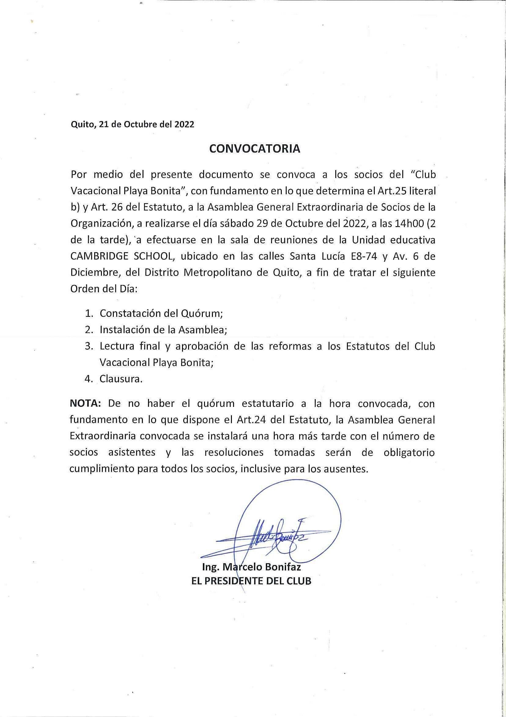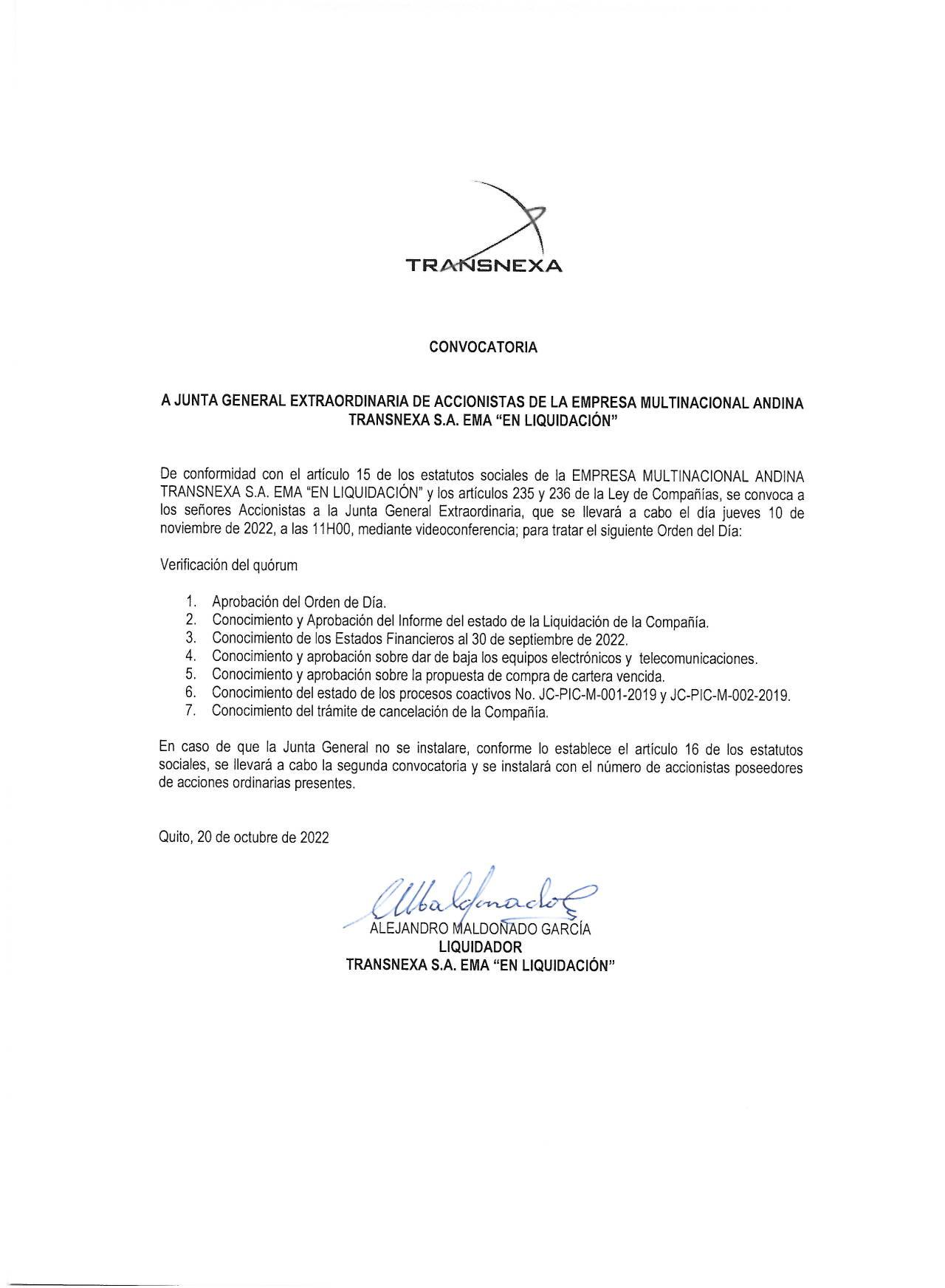 De conformidad con lo dispuesto en la Ley y en el Estatuto Social, en calidad de administradores de la empresa, convocamos a los señores accionistas a la Junta General Ordinaria a llevarse a cabo el día 29 de octubre del 2022, a las 08:30am en la sede de la Empresa, ubicada en la parroquia de Cusubamba, Barrio Rosalía, Calle Enriqueta Bustamante y pasaje B, en el que se tratara el siguiente orden del día: