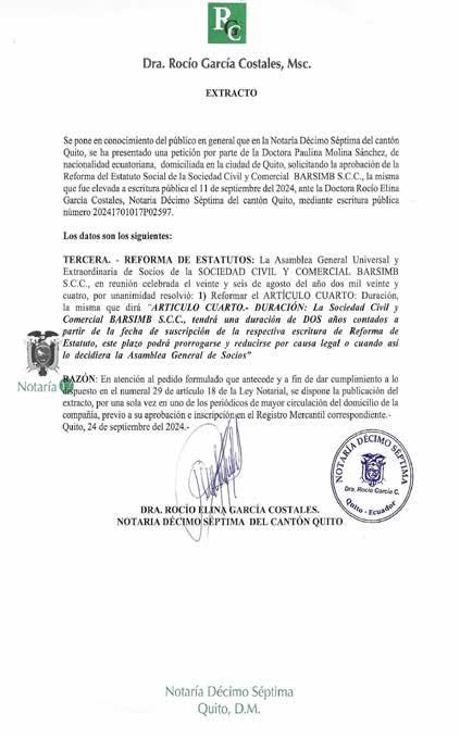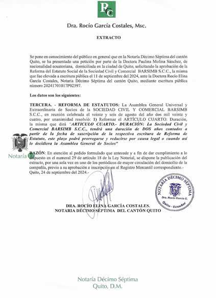 Cúmpleme de poner en conocimiento que mediante escritura pública Número 20241701018P02414, celebrada el diecisiete (17) de septiembre de dos mil veinticuatro (2024), ante la suscrita Notaria Décima Octava Cantón Quito, Doctora GLENDA ZAPATA SILVA, se Aumentó el Capital y consecuentemente Reforma del Estatuto Social LE CHIC CHE SOCIEDAD CIVIL Y COMERCIAL