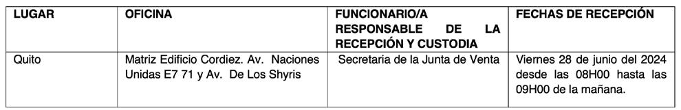 A las 10H00 de la mañana del día 28 de junio del 2024, la Junta de Venta se reunirá en sesión pública, en la ciudad de Quito, Edificio Cordiez, Av. Naciones Unidas E7 71 y Av. De Los Shyris y procederá al pronunciamiento respecto a la validez de la venta directa, la apertura de sobres en presencia de los interesados, leer y calificar las ofertas, determinación del orden preferencial, resolución de adjudicación a los mejores postores, por cada bien, según su orden.