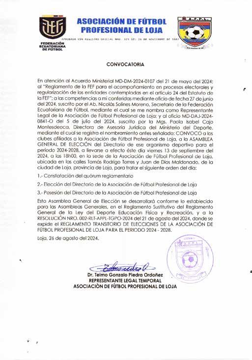 De conformidad con las disposiciones establecidas en la Ley del Deporte, Educación Física y Recreación y su Reglamento General vigente, se convoca a los clubes filiales DE LIGA DEPORTIVA BARRIAL “BARRIONUEVO”, a la Asamblea General de Elecciones que se celebrará en la sede de la Liga ubicada en la Av. Teniente Hugo Ortiz y Rosa Yeira, Barrio Barrionuevo, Cantón Quito, Provincia de Pichincha, el día 10 de septiembre de 2024 a partir de las 19H00 horas con el objeto de conocer el siguiente orden del día: