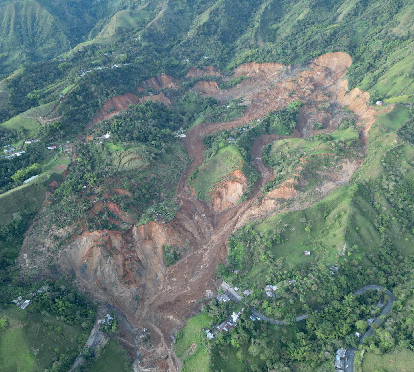 DAÑO. Un grupo de personas observa el derrumbe que destruyó al menos cinco comunas, en Rosas, Cauca (Colombia).