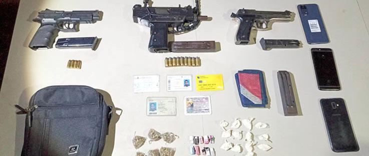 Entre las evidencias decomisadas consta: una subametralladora, dos pistolas, 18 municiones, 10 gramos de marihuana, 19 gramos de cocaína, un cargador de arma de fuego, celulares y documentos de diferentes