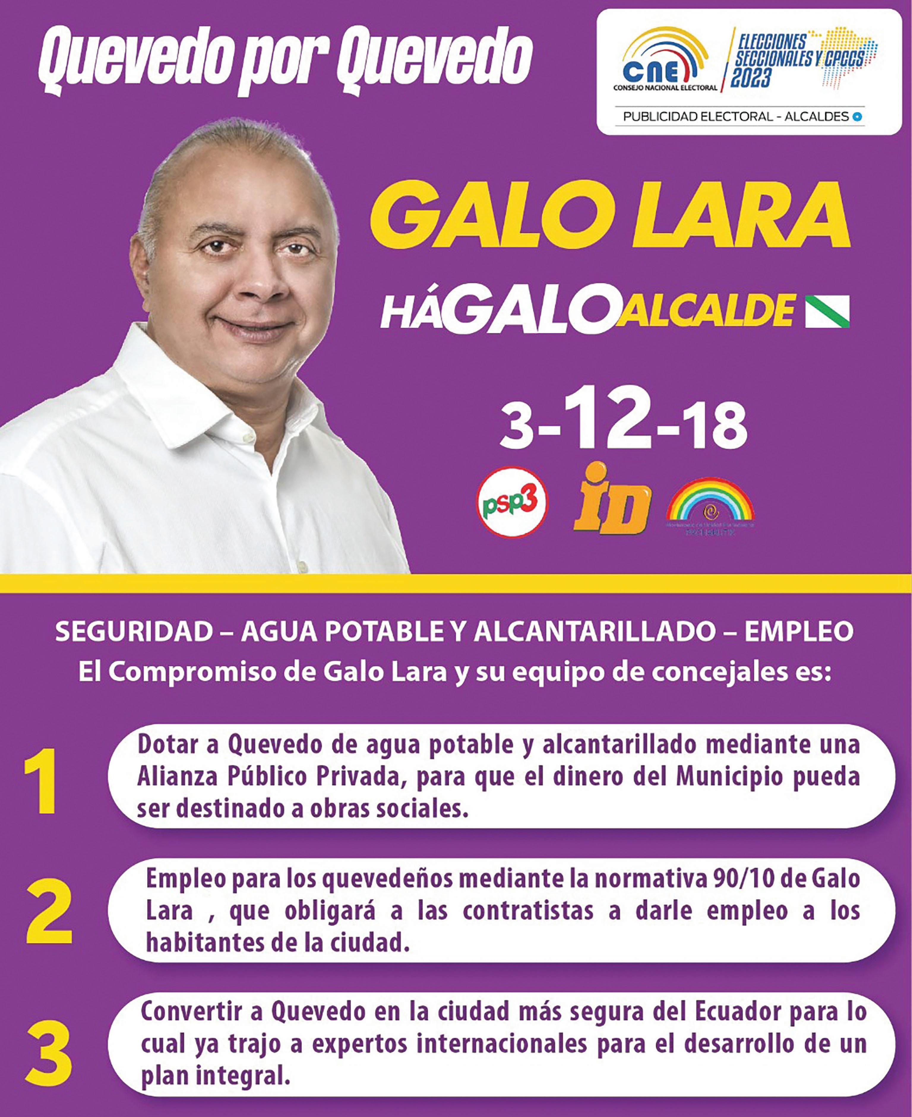 Al candidato Galo Lara se lo ha observado disertando su propuesta de trabajo, en la cual ha priorizado la seguridad ciudadana, la entrega de un tanque de gas y una canasta de víveres mensualmente.