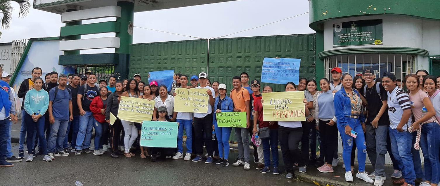 Con gritos y carteles en mano pedían que se les permita utilizar las instalaciones de la Universidad Técnica de Babahoyo, UTB, lugar donde hasta hace un año estudiaban de manera presencial.