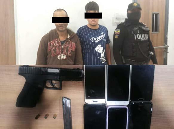 Daniel Ch., y Jandry M., desvalijaron a varias personas que estaban en el interior de un restaurante de comida china. Uniformados de la Policía Nacional les decomisó una pistola cargada con dos municiones y cinco celulares.