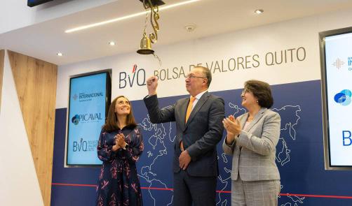El “campanazo” para celebrar la colocación de bonos azules en Latino américa por parte del Banco Internacional se realizó el 22 de noviembre de 2022 en la Bolsa de Valores de Quito. Esta emisión asciende a $79 millones. Estos recursos financiarán los créditos que el banco ofrece a empresas que contribuyan a la preservación de recursos hídri