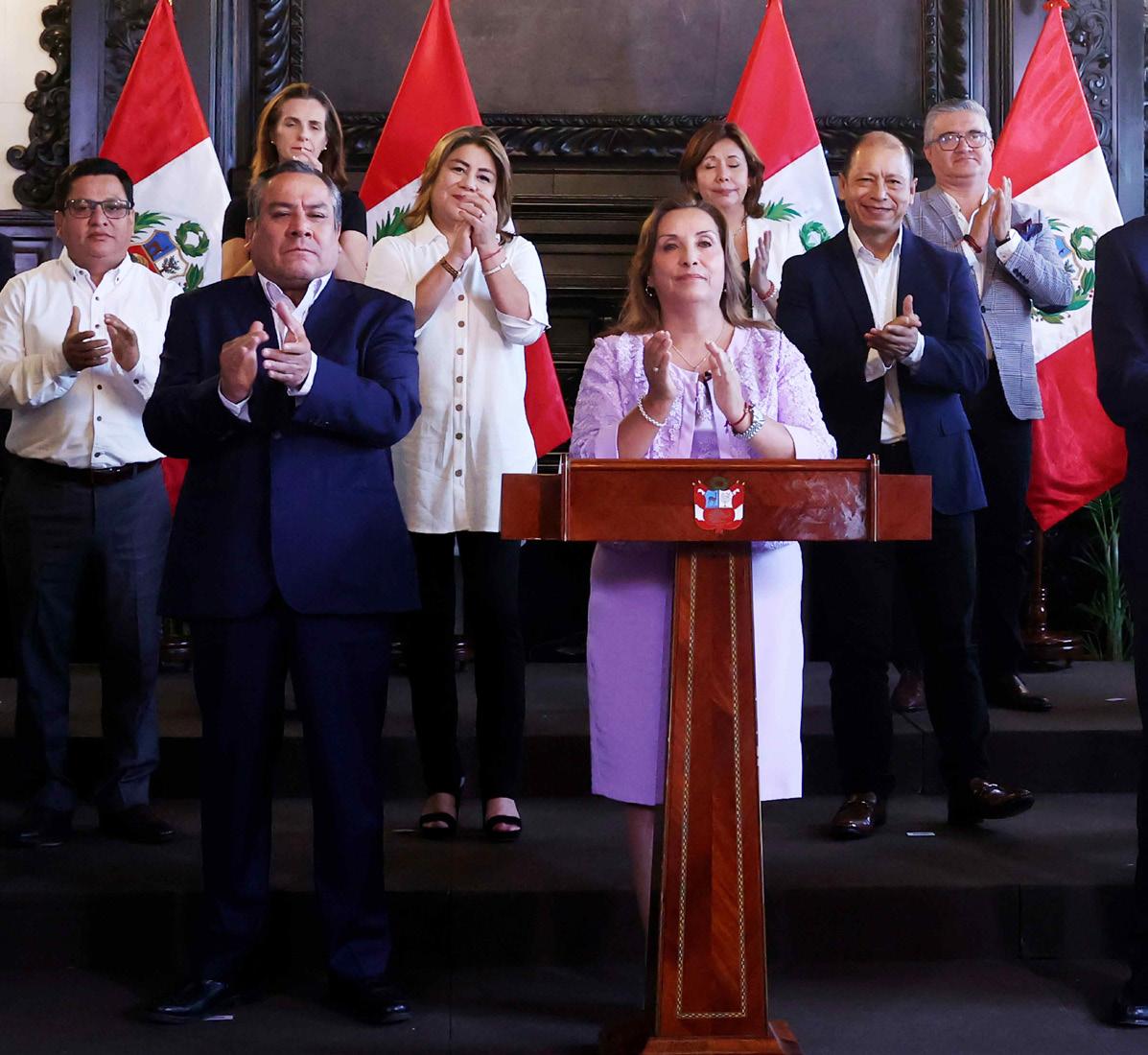 ACTO. Dina Boluarte, durante un discurso a la Nación en compañía de su gabinete de Ministros. EFE