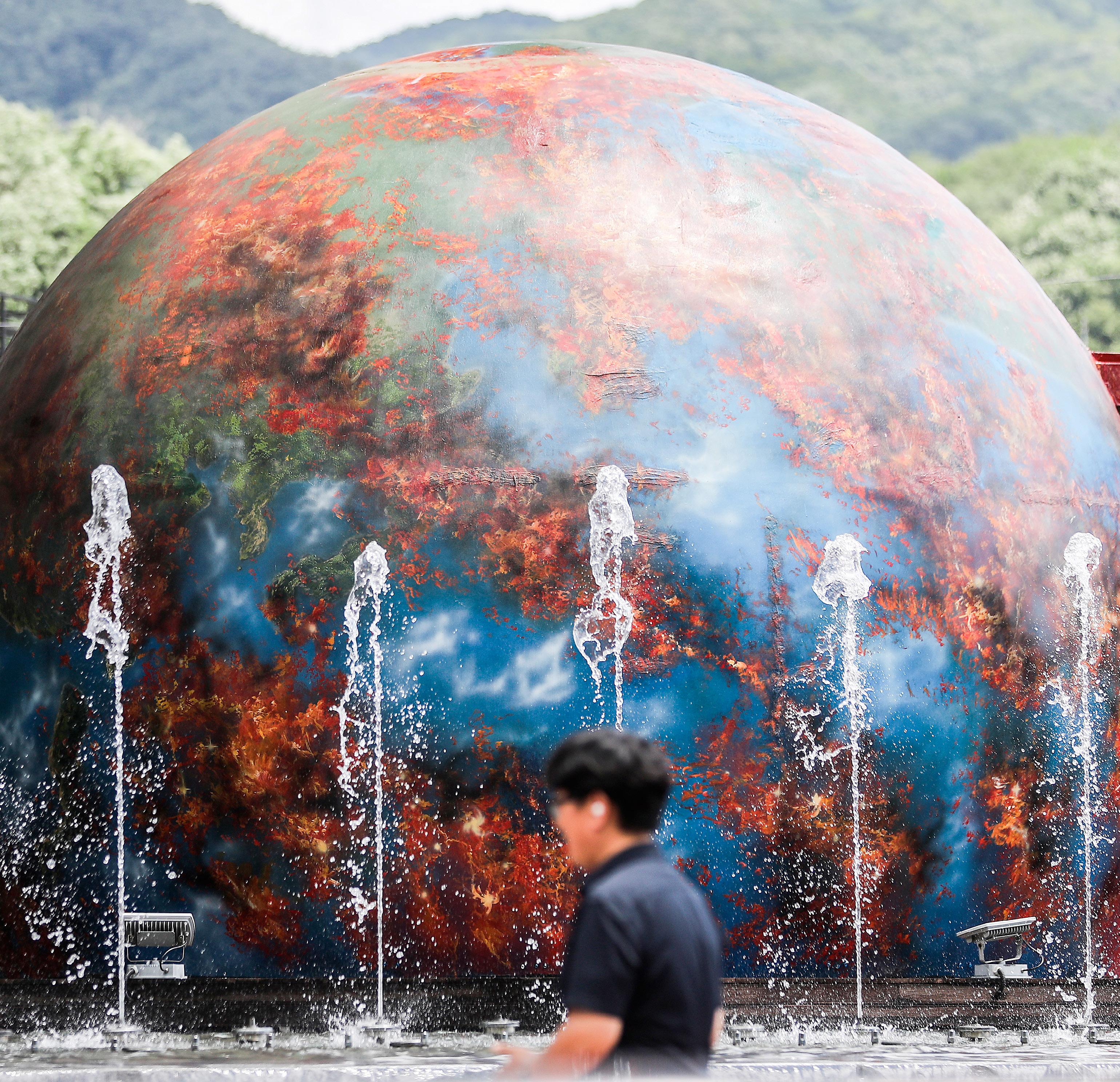 Un hombre camina frente a una instalación que muestra una Tierra en llamas en un parque en Daegu, al sureste de Seúl, Corea del Sur, como una alerta de la ola de calor que se emitió en la región. La temperatura global promedio sobre la superficie del planeta marcó este 4 de julio de 2023 el récord de 17,18 grados Celsius (62,92 Fahrenheit). EFE