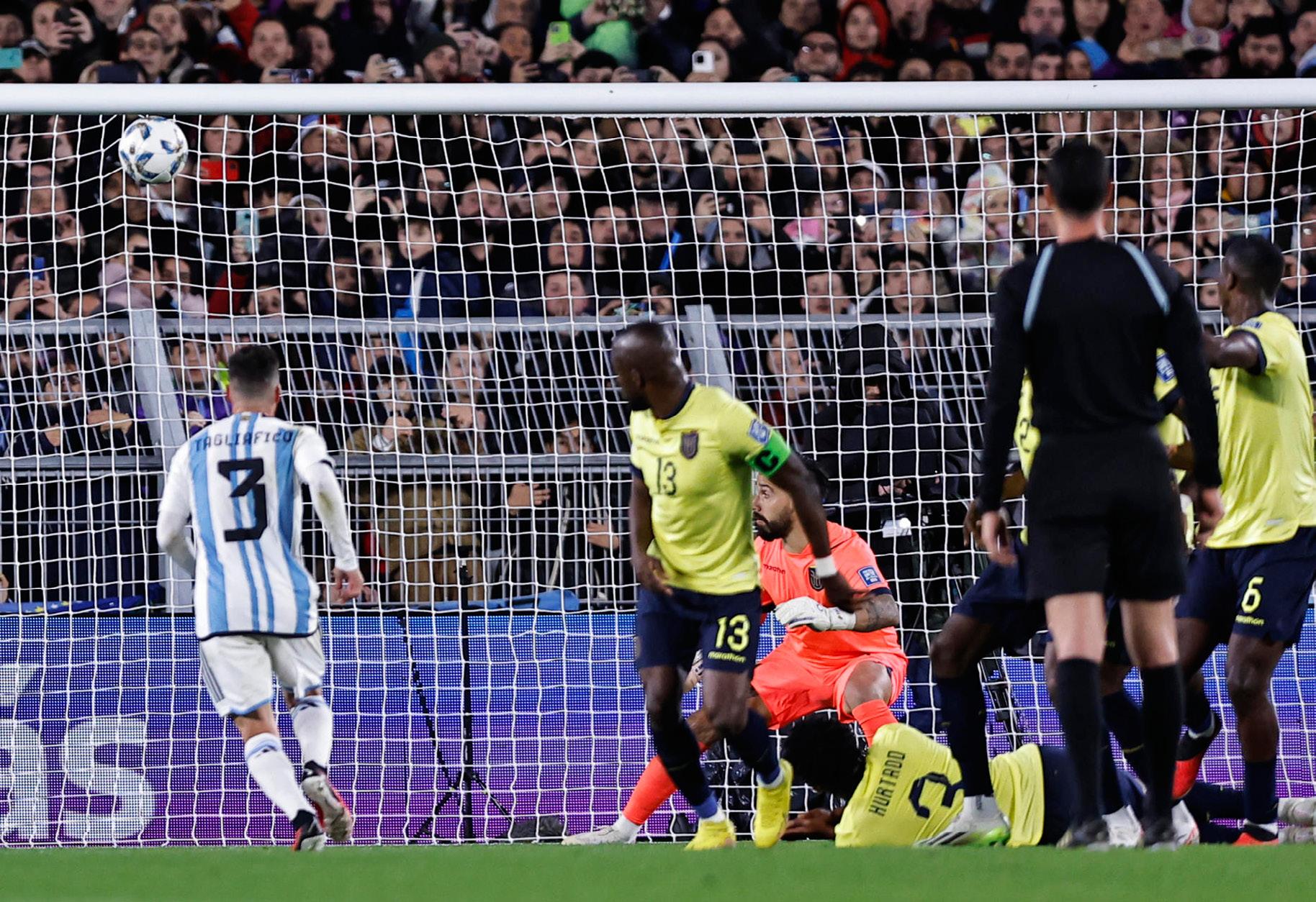 Y en el minuto 54 llegó otra acción de peligro para Argentina con un tiro libre perfecto de Messi para el golpe de cabeza de Alexis Mac Allister que exigió una reacción espectacular de Hernán Galíndez para salvar la caída de su valla.