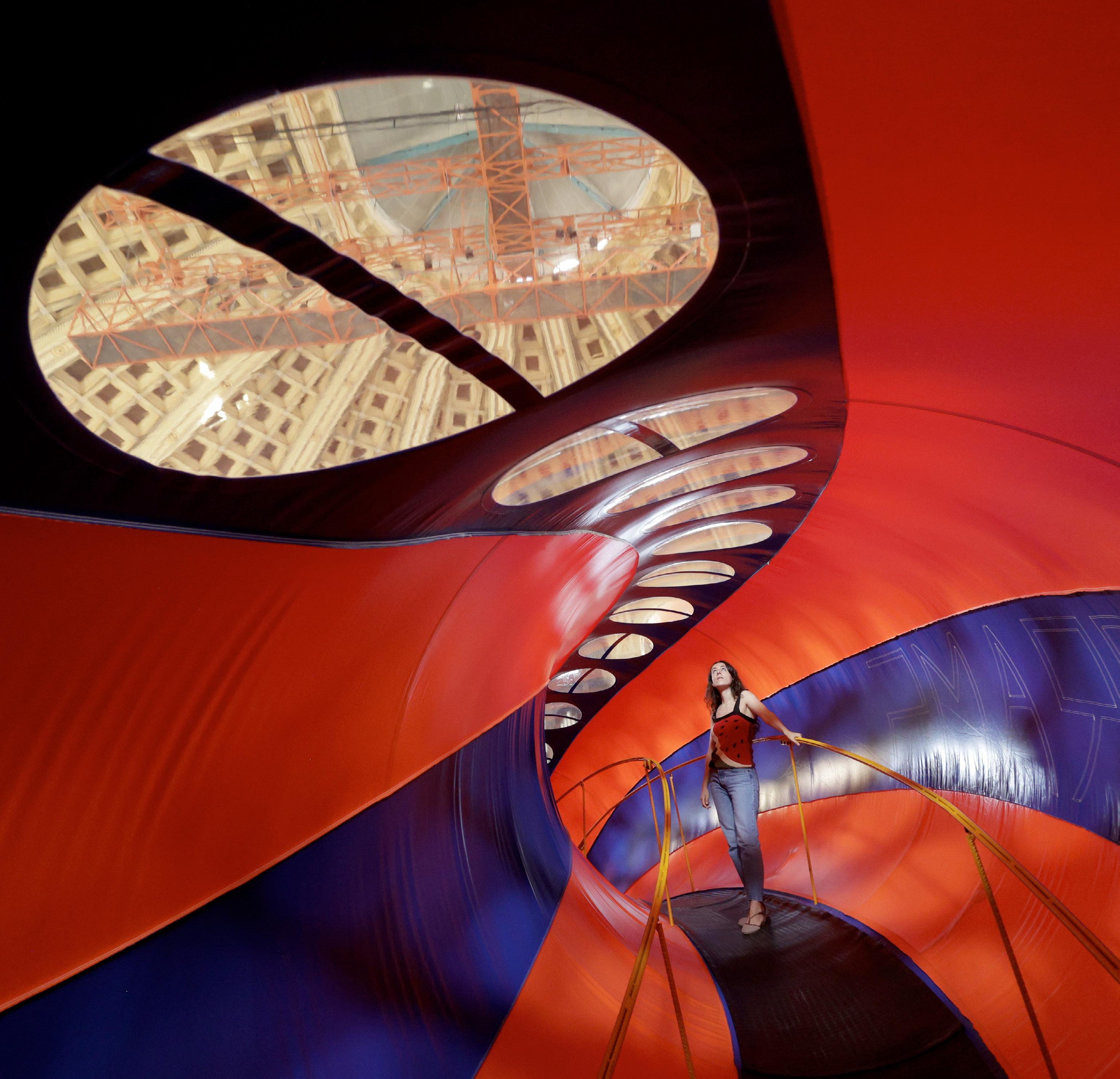 La artista Laia Estruch instaló en la Sala Oval del Museo Nacional de Arte de Cataluña una escultura sonora gigante con forma de trenza, titulada ‘Trena’, formada por tres tubos inflables trenzados de 2,2 metros de diámetro por 35 metros de largo y que tiene carácter performativo, ya que se activa cada hora en punto con una pieza musical de un minuto y 48 segundos de duración, producida con la colaboración de Xavi Lloses. EFE