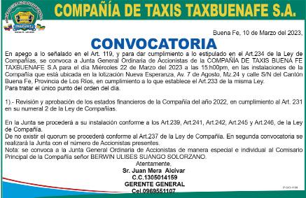 Se convoca expresamente, en forma individual y particular al Auditor Externo de la compañía, quién también es su comisario PriceWaterHouseCoopers. cuya dirección es: Avenida 6 de Diciembre y Boussingault Edificio T6, Pisos 13 y 14. Mediante comunicación particular electrónica se ha enviado esta convocatoria al Auditor Externo. De conformidad con la ley, los documentos a ser conocidos y aprobados por la Junta, se encuentran a disposición de los accionistas en la oficina de la CTH S.A.