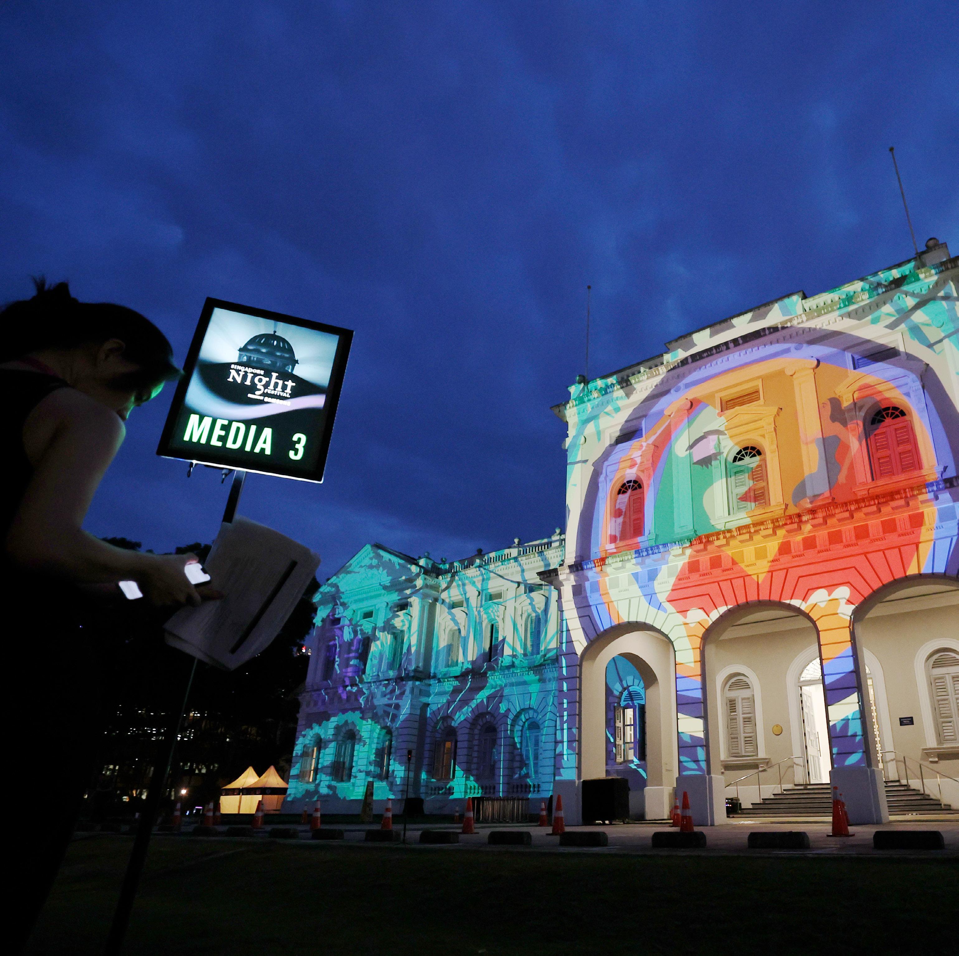 Vista de la instalación de arte lumínico titulada ‘700 años’, obra de los artistas Zizi Majid, Muhammad Izdi y Jeremie Bellot, proyectada en la fachada del Museo Nacional de Singapur durante la presentación del Festival Nocturno de Singapur. EFE