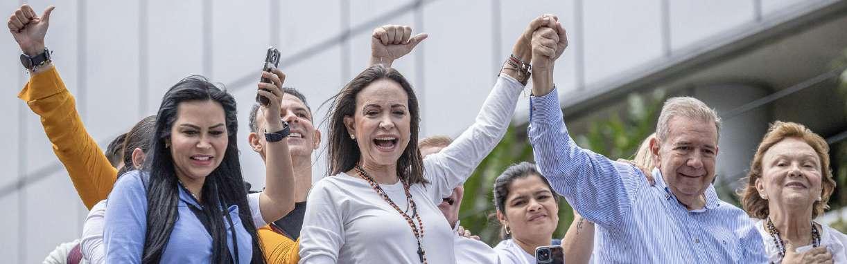 CriSiS. La líder opositora venezolana María Corina Machado (2i) y el abanderado de la oposición a la presidencia de Venezuela Edmundo González Urrutia (d) rechazan el fallo
