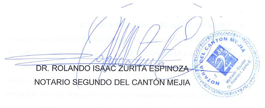Doctor Rolando Isaac Zurita Espinoza, Notario Segundo del cantón Mejía, amparado en lo que dispone el Artículo 18 de la Ley Reformatoria a la Ley Notarial, publicada en el Registro Oficial No. 406 el 28 de Noviembre del 2.006, dispongo que, por una sola vez, se publique en uno de los periódicos de circulación Nacional, la LIQUIDACION DE LA SOCIEDAD CONYUGAL DE LOS SEÑORES FAUSTO ANÍBAL GUAMÁN GÓMEZ y MARISA DEL PILAR CAIZA COLLAGUAZO , quienes de común acuerdo, libre y voluntariamente han convenido liquidar la extinta sociedad conyugal que formaron entre sí, en la forma que se detalla a continuación: el señor FAUSTO ANÍBAL GUAMÁN GÓMEZ adjudica a la señora MARISA DEL PILAR CAIZA COLLAGUAZO, y ella toma para sí, diez participaciones en la Compañía Transguaman Compañía Limitada, VALORADO EN DIEZ DÓLARES AMERICANOS; y, el vehículo de placas: PAA2445, Número motor 79504027; chasis 3HSCEAPT4CN595877; Modelo TRACTO CAMION 92001 SBA 6X4 LOW ROOF; Marca: INTERNATIONAL; AÑO 2012; y, más especificaciones constantes en la cláusula segunda de