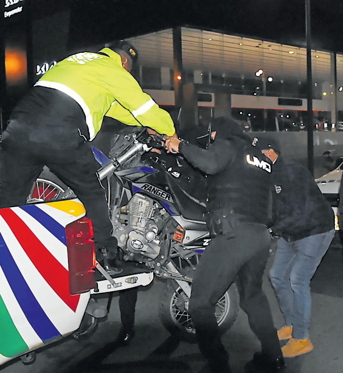 Cuando se observan a dos hombres en motocicletas, el procedimiento es responsabilidad de los agentes civiles de tránsito. A no ser que los ocupantes hayan sido neutralizados en medio de un delito flagrante o que el transporte sea robado, en esos casos actúa la Policía Nacional.