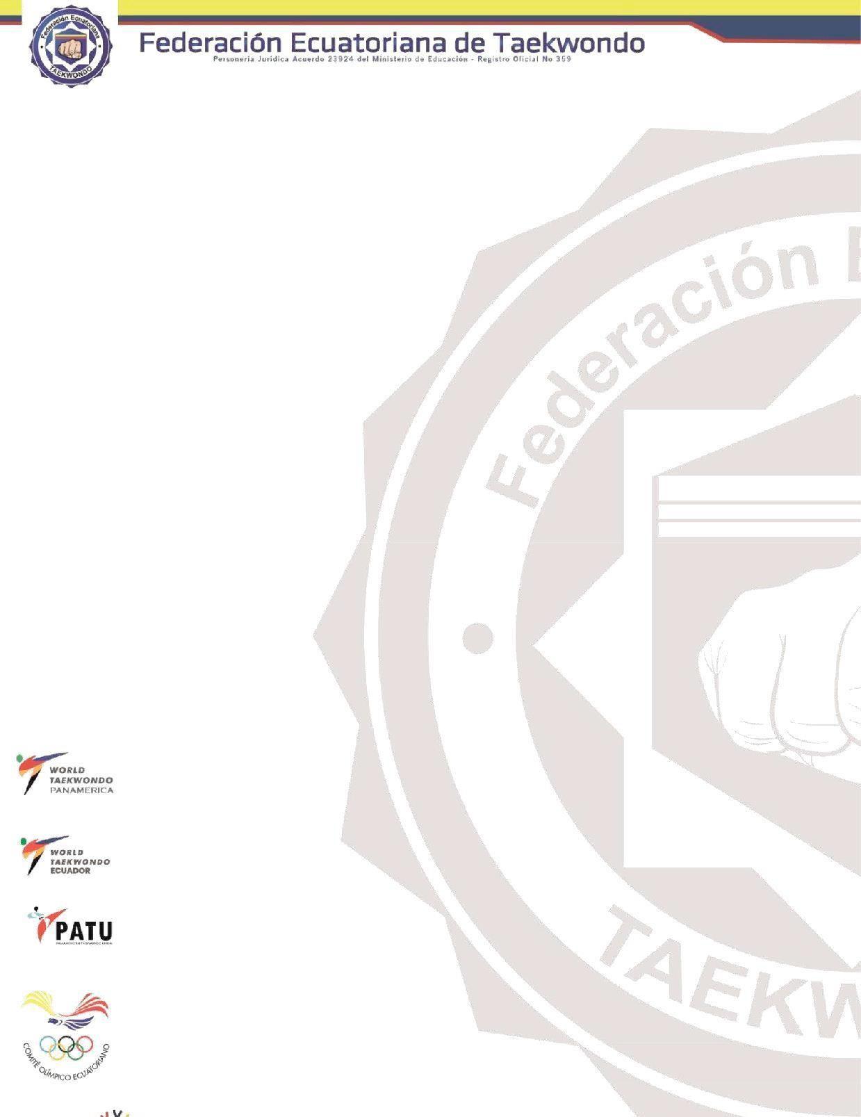 En atención a los Arts. 13, 14, 16 y 17 del Reglamento Sustitutivo del Reglamento General de la Ley del Deporte, Educación Física y Recreación; y a los Arts. 21, 22, 23, 24, 25, 26, 27 y 28 del Estatuto de la Federación Ecuatoriana de Taekwondo, CONVOCO a ASAMBLEA GENERAL ORDINARIA DE LA FEDERACIÒN