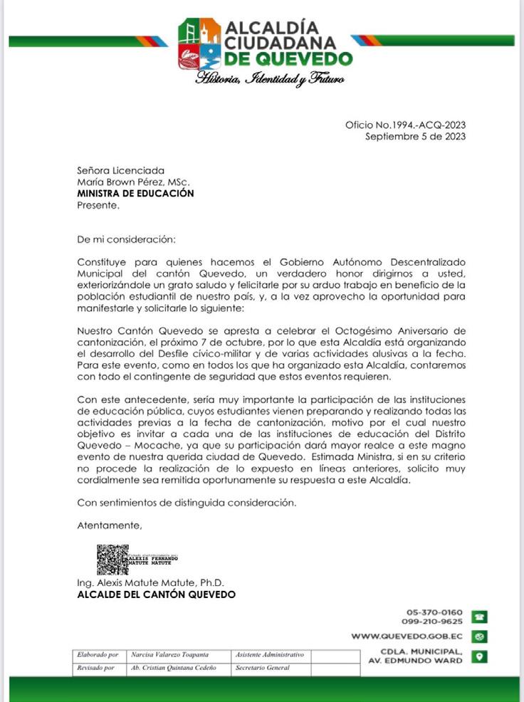 Un oficio fue enviado al Ministerio de Educación, Mineduc, por parte de Alexis Matute, alcalde de Quevedo. En el documento se solicita a la ministra María Brown Pérez que confirme si existe o no alguna prohibición para la realización del Desfile Cívico Estudiantil a realizarse el próximo 7 de octubre, con motivo de celebrar los 80 años de creación del cantón. El pedido se lo hace luego de que la representante del Distrito de Educación Quevedo - Mocache diera a conocer que este año no se realizará el desfile, limitando así la participación de las instituciones educativas fiscales, pese a que los alumnos y padres de familia ya habían invertido tiempo y dinero en ensayos y confección de trajes.
