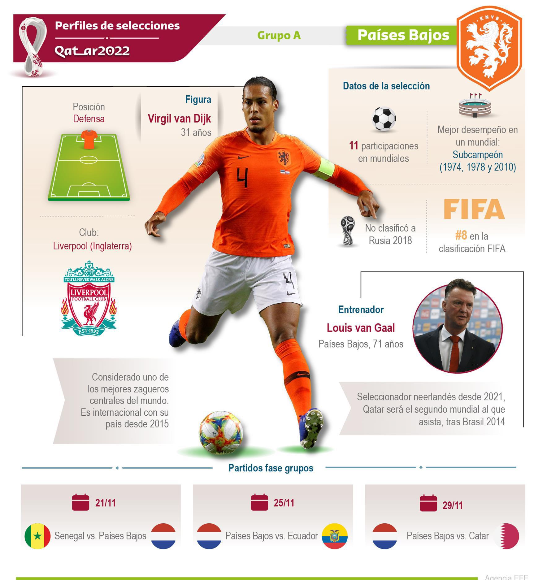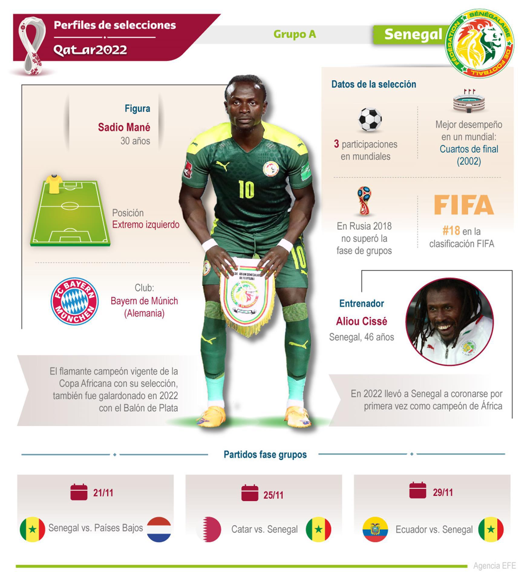 EFE. Contiene figuras, técnicos y estadísticas de las Selecciones de Ecuador, Qatar, Países Bajos y Senegal, pertenecientes al Grupo A, a propósito del Mundial de Fútbol de Qatar 2022 que arranca el próximo 20 de noviembre de 2022.